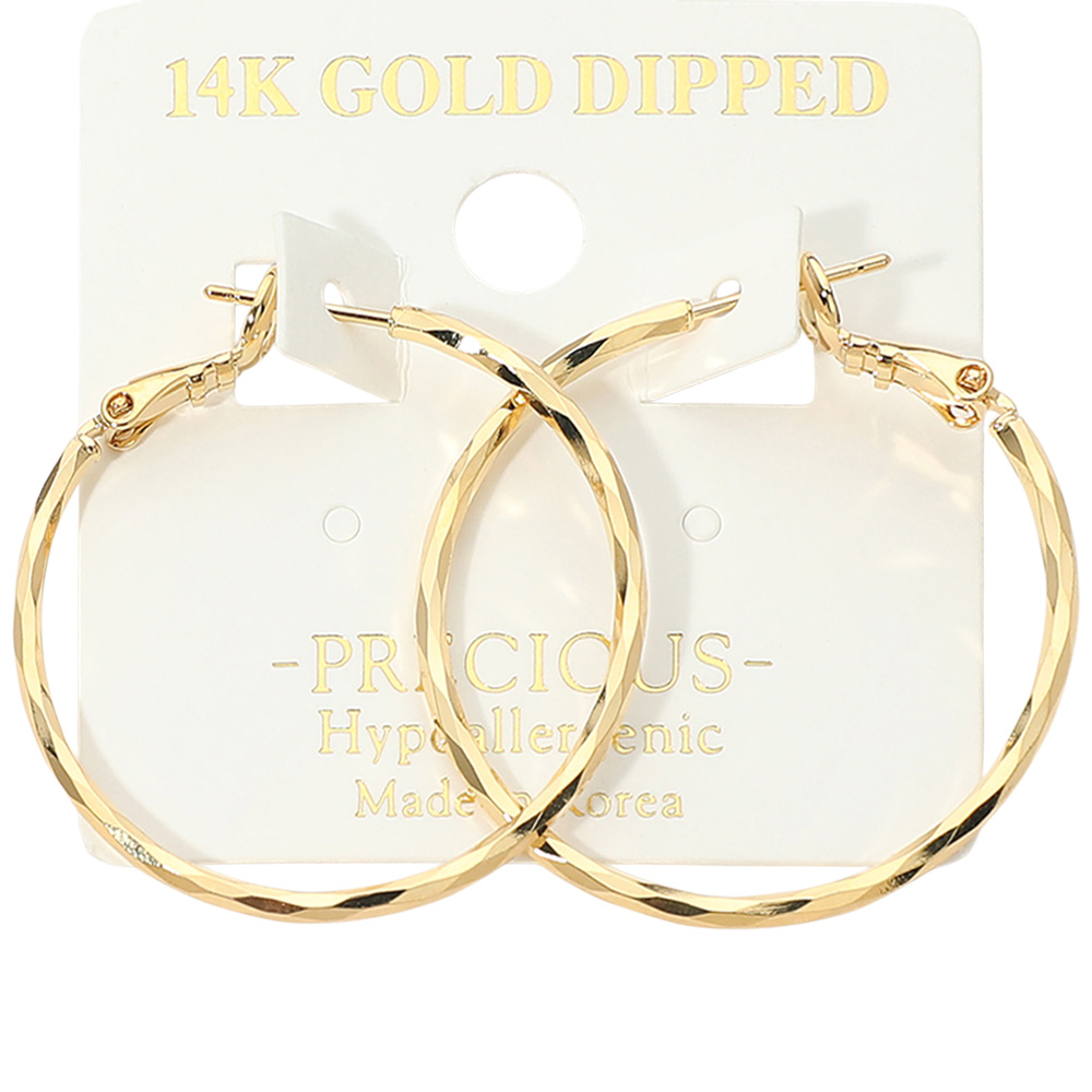 Details • Size : 1.3" X 1.3" • Omega Back • These classic twisted hoop earrings feature a refined faceted design that adds subtle texture and shine. Designed with a secure latch closure for easy wear and a dependable fit, they are ideal for everyday styling or special occasions, offering timeless appeal, comfort, and versatile elegance. • Gold Dipped • Hypoallergenic • Made In Korea
