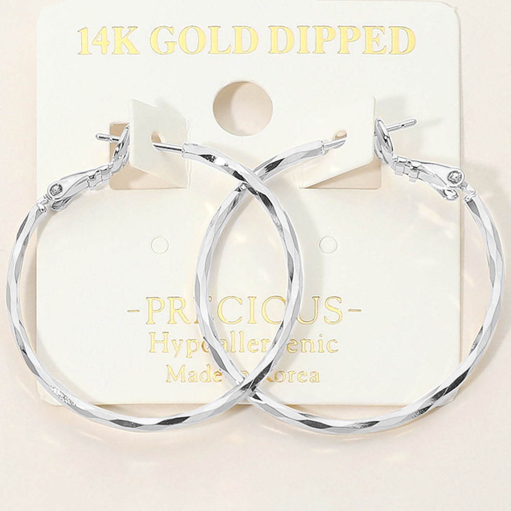 Details • Size : 1.3" X 1.3" • Omega Back • These classic twisted hoop earrings feature a refined faceted design that adds subtle texture and shine. Designed with a secure latch closure for easy wear and a dependable fit, they are ideal for everyday styling or special occasions, offering timeless appeal, comfort, and versatile elegance. • Gold Dipped • Hypoallergenic • Made In Korea