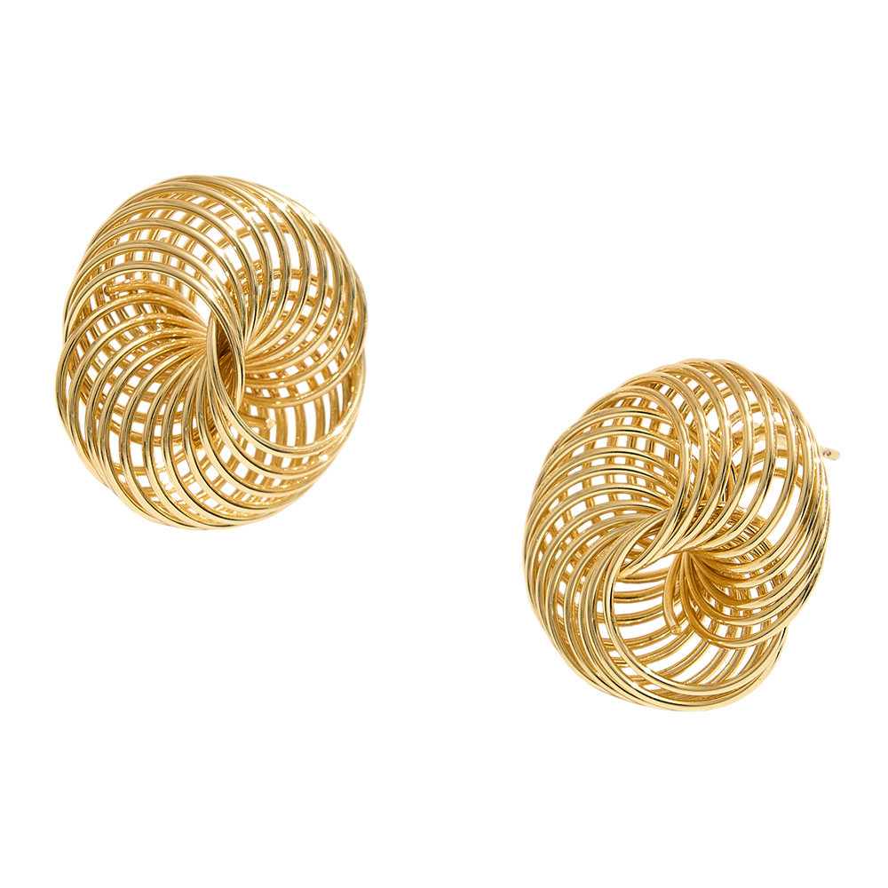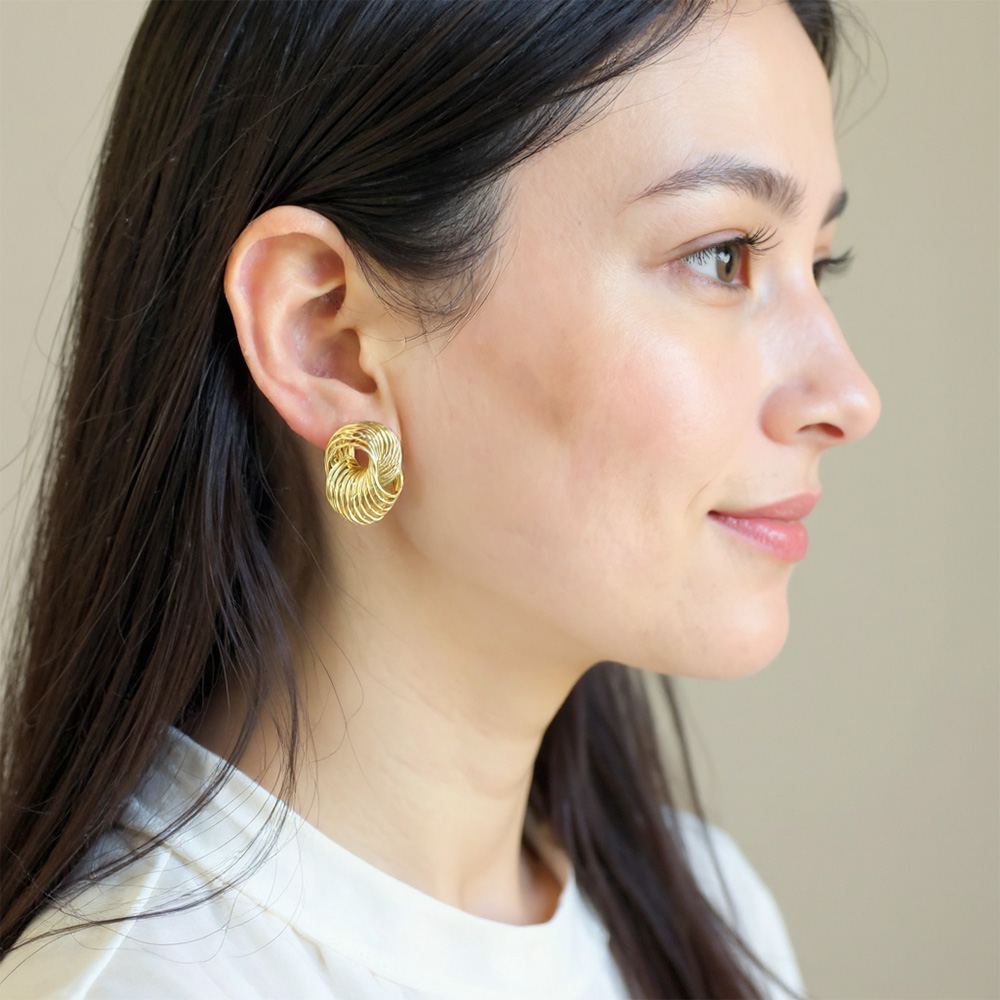 Details • Size : 1" X 1" • Post Back • Elegant knot stud earrings crafted with interwoven wire loops, creating a bold yet refined sculptural design. Lightweight and versatile, these earrings add modern sophistication to casual or formal outfits, making them a timeless accessory for jewelry collections and everyday wear. • Lead and Nickel Compliant • Hypoallergenic • Made In Korea • Gold Dipped • Brass