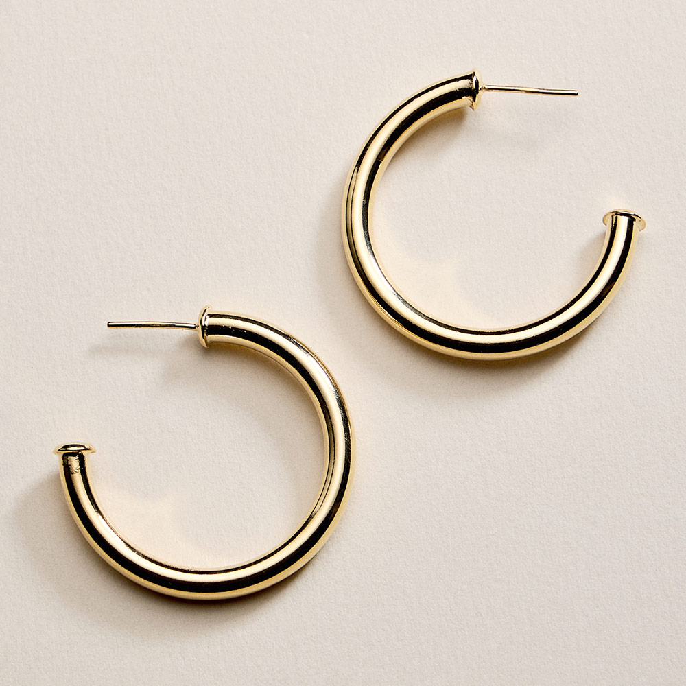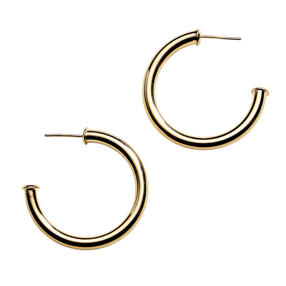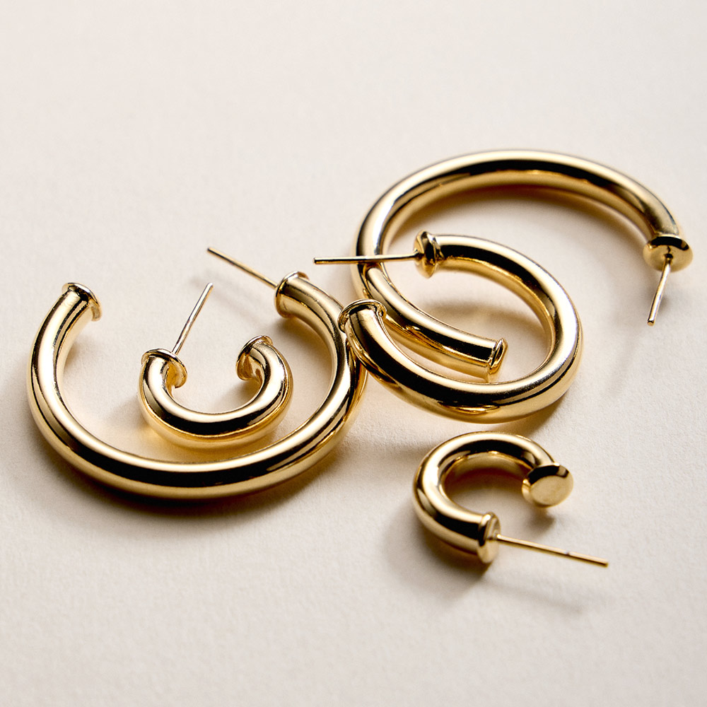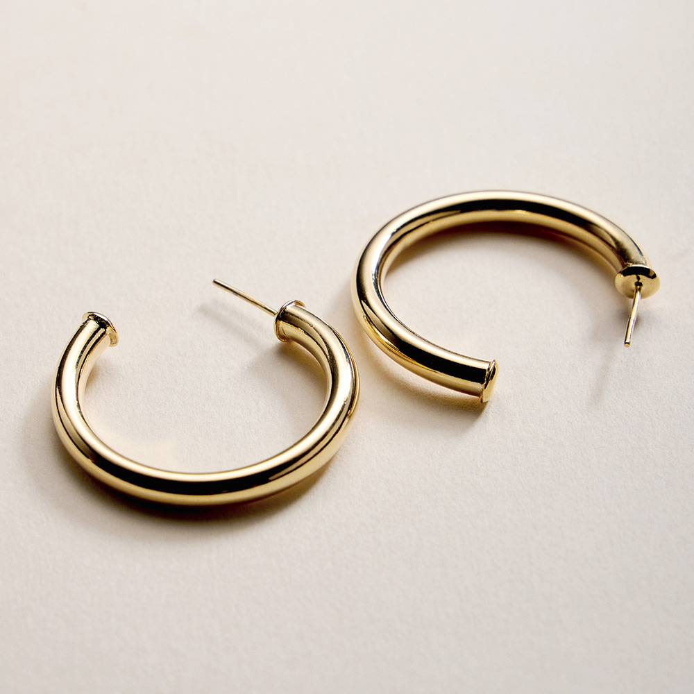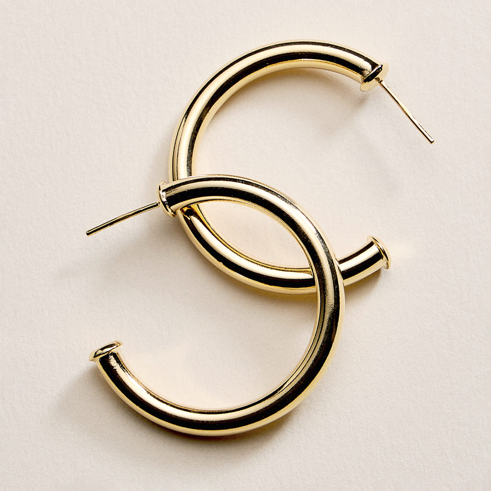 Details • Size : 1.3" X 1.3" • Post Back • Sleek hoop earrings designed with a smooth curved silhouette for timeless appeal. Comfortable and lightweight for all-day wear, these versatile hoops complement casual looks and elevated outfits alike, making them an essential jewelry staple for modern, minimalist, and trend-forward collections. • Gold Filled • Hypoallergenic • Lead and Nickel Compliant • Made In Brazil