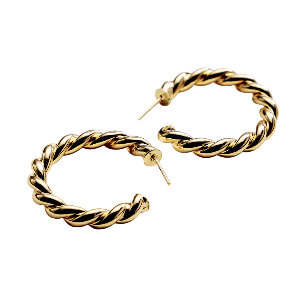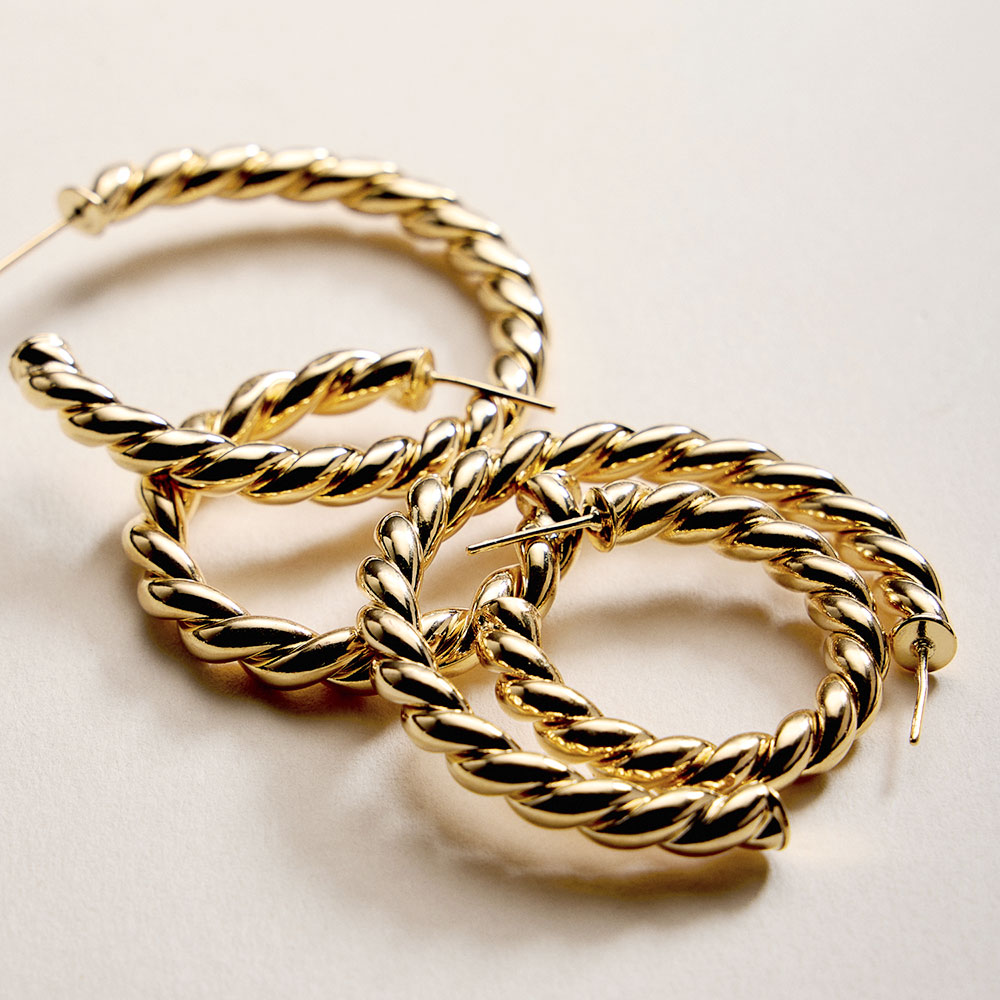 Details • Size : 1.5" X 1.5" X 0.25" • Post Back • Bold twisted hoop earrings featuring a rope-inspired design that adds texture and movement to any outfit. A timeless silhouette with a modern edge, perfect for everyday wear or elevated styling, ideal for gifting, layering, or making a confident statement with effortless versatility. • Lead and Nickel Compliant • Hypoallergenic • Gold Filled • Made In Brazil