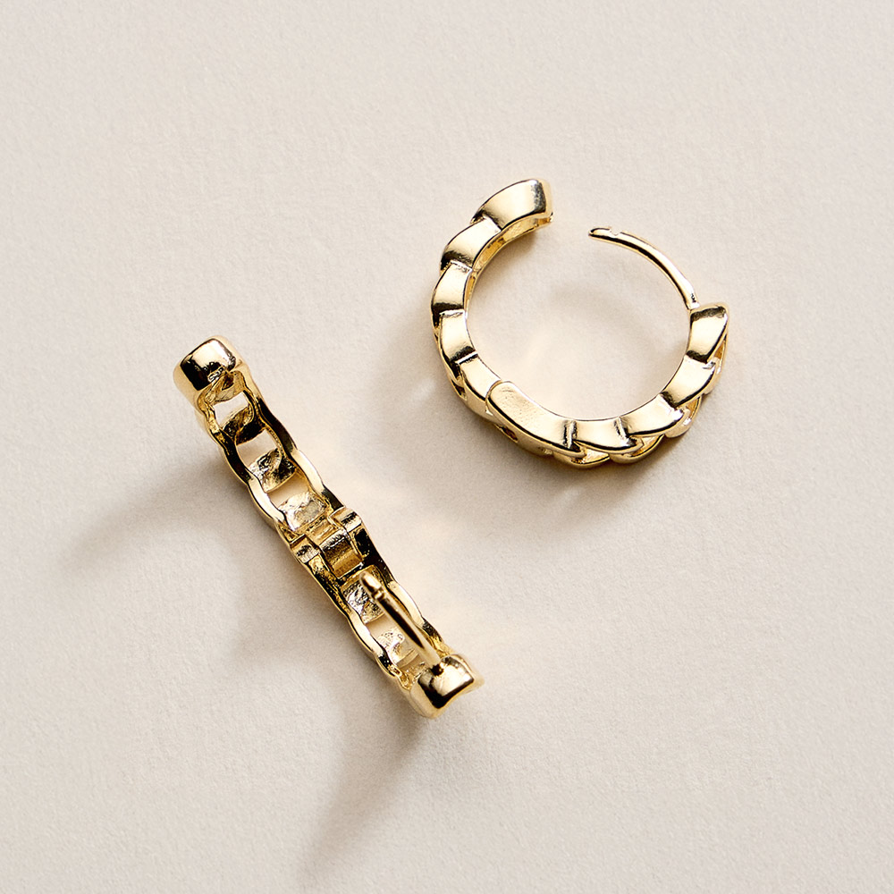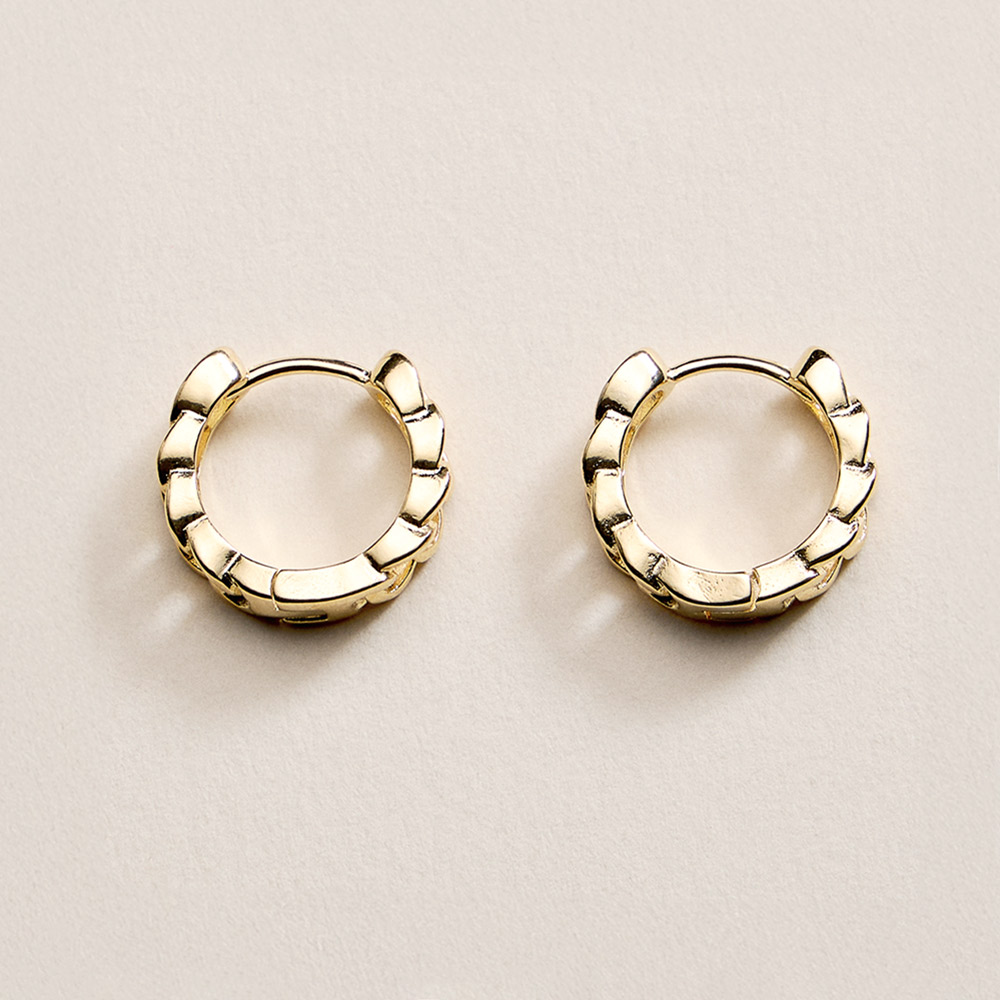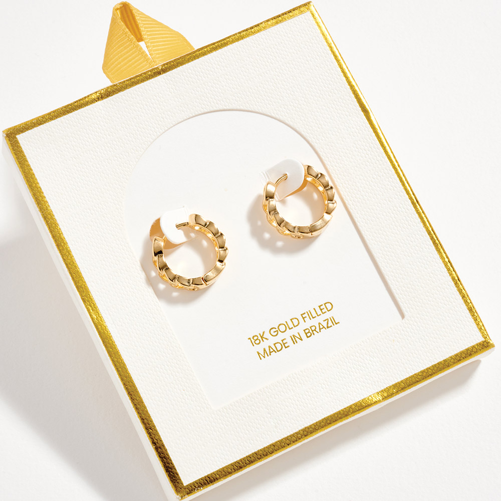 Details • Size : 0.6" X 0.6" • Huggie Back • Classic twisted hoop stud earrings featuring a sculpted, textured design that adds subtle dimension and shine. The compact hoop size makes them ideal for everyday wear, office looks, and effortless styling. A timeless accessory that pairs easily with casual and elevated outfits while offering versatile merchandising appeal. • Gold Filled • Hypoallergenic • Lead and Nickel Compliant • Made In Brazil