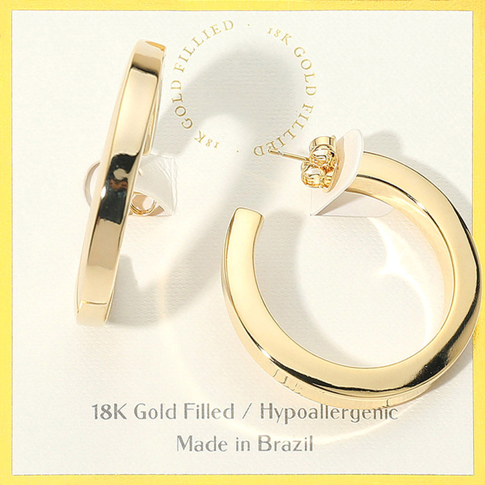 Details • Size : 1.6" X 1.6" X 0.25" • Post Back • Water Resistant and Tarnish Free • Make a confident style statement with these wide hoop earrings featuring a sleek, polished finish. Their bold design elevates everyday looks while adding a sophisticated edge to evening outfits. Lightweight and versatile, they are the perfect blend of modern chic and timeless style. • Gold Filled • Hypoallergenic • Lead and Nickel Compliant • Made In Brazil