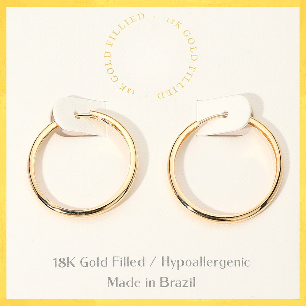 Details • Size : 1.2" X 1" • Hoop Wire Back • These timeless 18K gold filled hoop earrings feature a sleek, minimalist design that complements any look. Hypoallergenic and comfortable for daily wear, they bring effortless elegance to casual or formal styles. Expertly crafted in Brazil for lasting beauty and shine. • Gold Filled • Hypoallergenic • Lead and Nickel Compliant • Made In Brazil