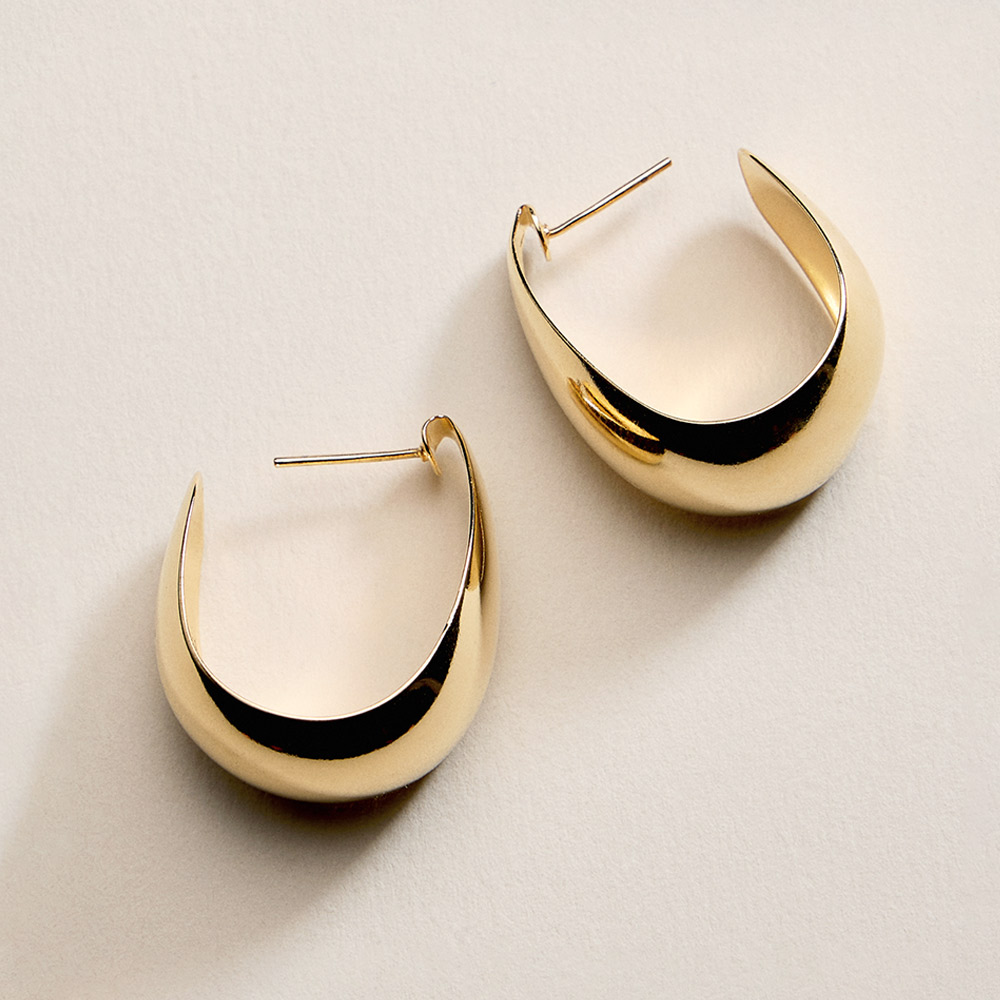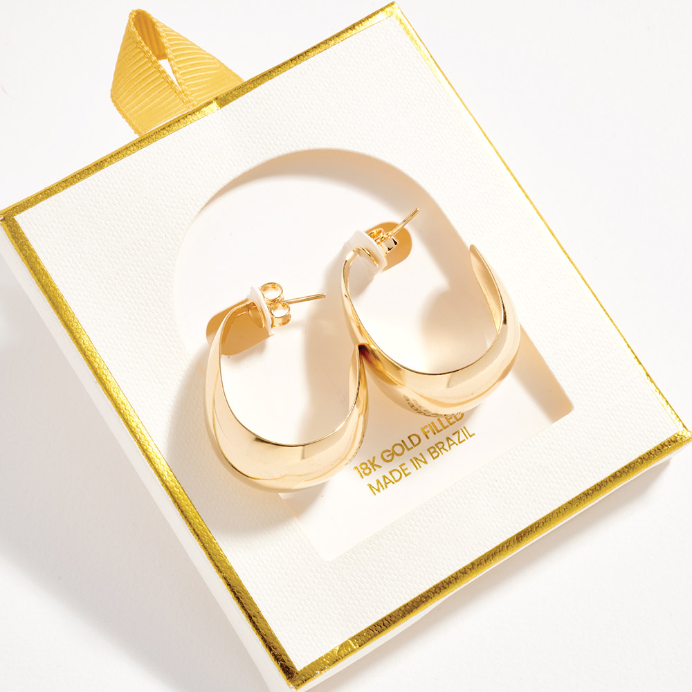 Details • Size : 1" X 1.25" X 0.6" • Post Back • Classic teardrop hoop earrings designed with a smooth polished silhouette for timeless everyday wear. Lightweight yet bold in shape, these hoops add effortless elegance to casual outfits or dressy looks. Easy to style and comfortable for all-day wear, they are a versatile jewelry essential for modern collections, layering, and gift-ready displays. • Gold Filled • Hypoallergenic • Lead and Nickel Compliant • Made In Brazil
