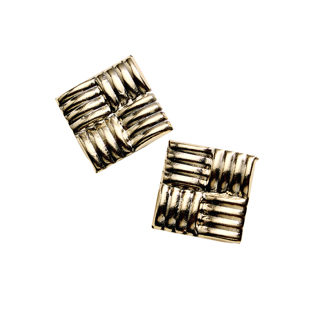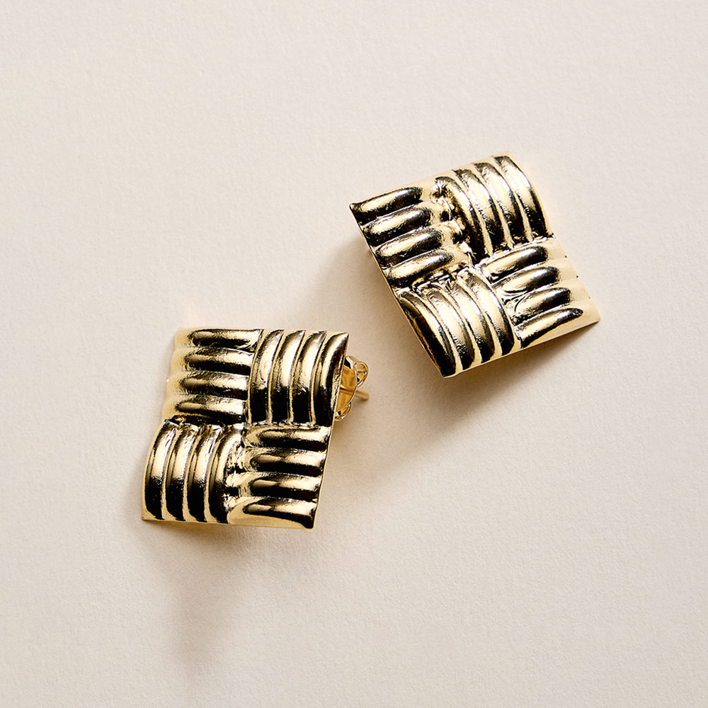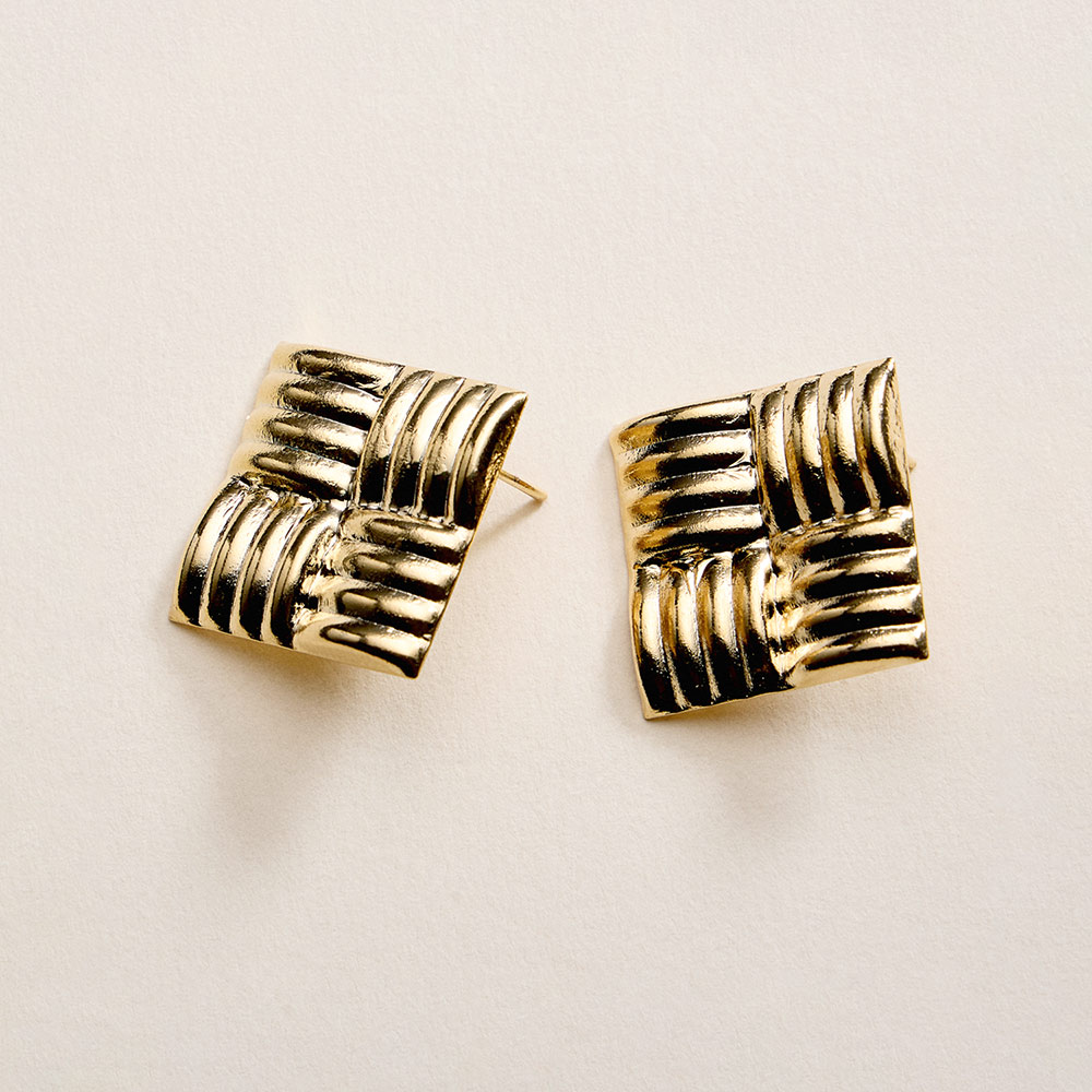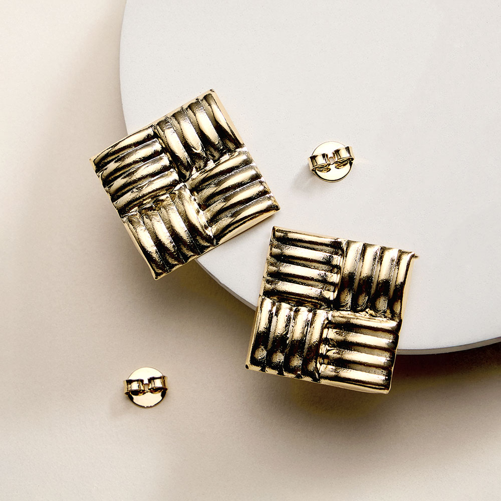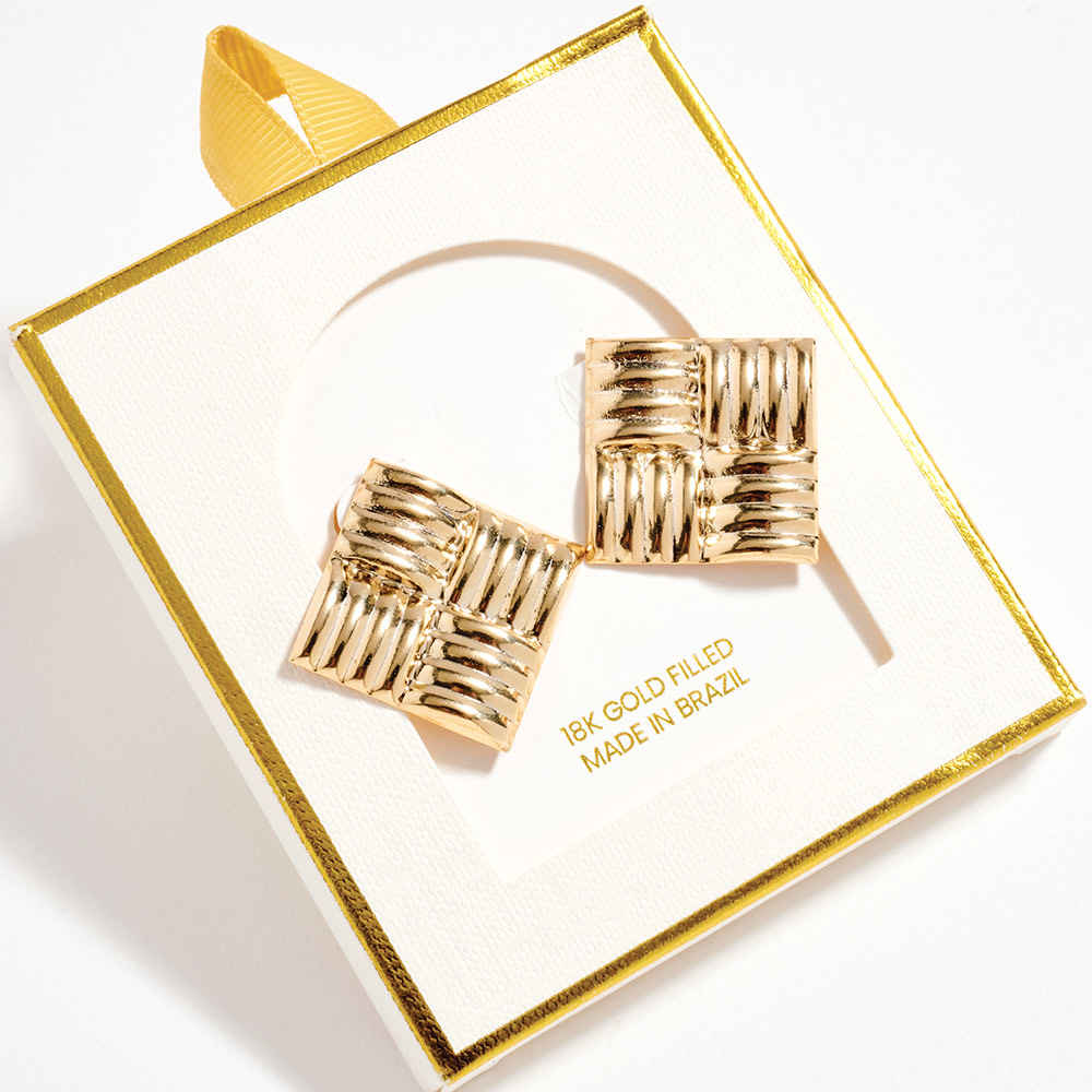 Details • Size : 1.25" X 1.25" • Post Back • Bold square stud earrings featuring a raised, sculpted texture that adds depth and shine to a clean geometric silhouette. Designed for effortless everyday wear, these statement studs pair easily with casual looks or polished outfits and make a timeless gift choice. • Gold Filled • Hypoallergenic • Lead and Nickel Compliant • Made In Brazil