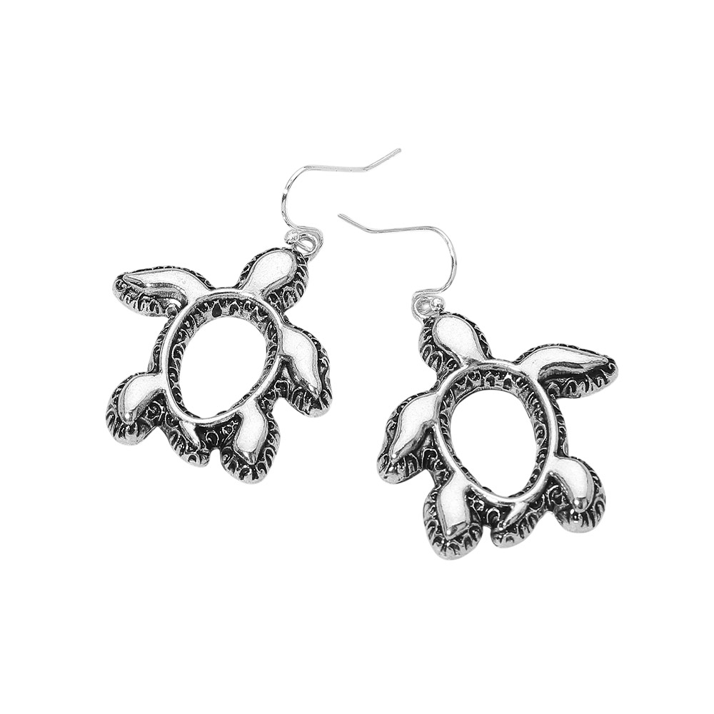 Details • Size : 1.25" X 1.75" • Fish Hook Back • Charming turtle drop earrings featuring an open oval center and textured detailing inspired by ocean life. Lightweight and easy to wear, these playful earrings are perfect for animal lovers, beach-themed gifts, boutique assortments, and everyday accessory styling. • Lead and Nickel Compliant