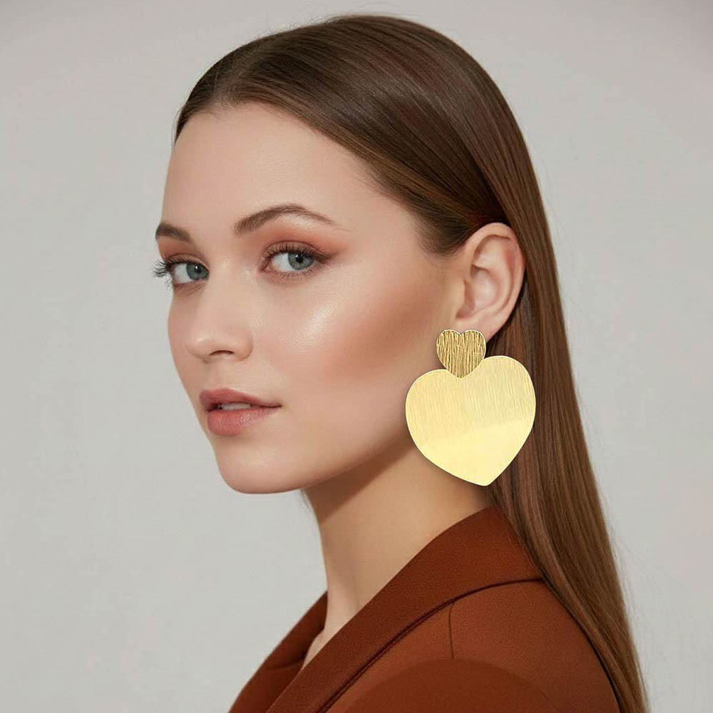 Details • Size : 2" X 2.4" • Post Back • These layered heart drop earrings feature a sculpted metal silhouette with subtle texture and graceful movement. Designed to make a statement without excess detail, they offer a modern romantic accent suitable for everyday wear, special occasions, or elevated styling. • Lead and Nickel Compliant