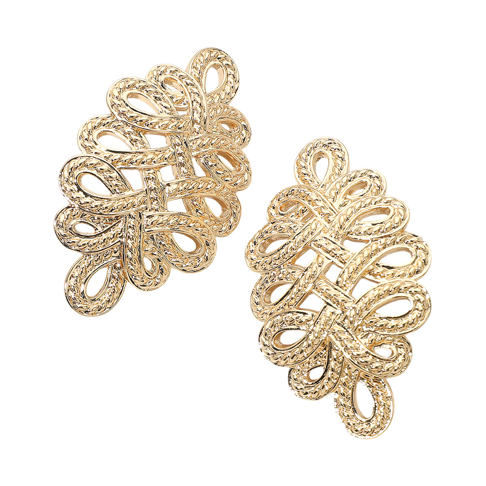 Details • Size : 1.4" X 2.25" • Post Back • Make a bold impression with these textured loop knot statement earrings. Designed with an intricate knot-inspired pattern, they add elegance and dimension, perfect for special occasions or elevating everyday outfits. • Lead and Nickel Compliant