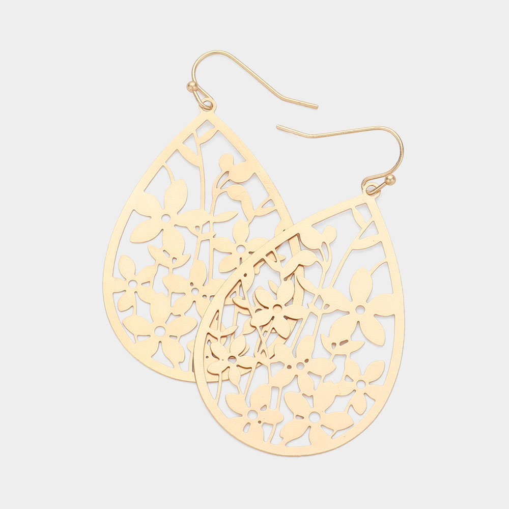 Brass Metal Flower Filigree Teardrop Dangle Earrings