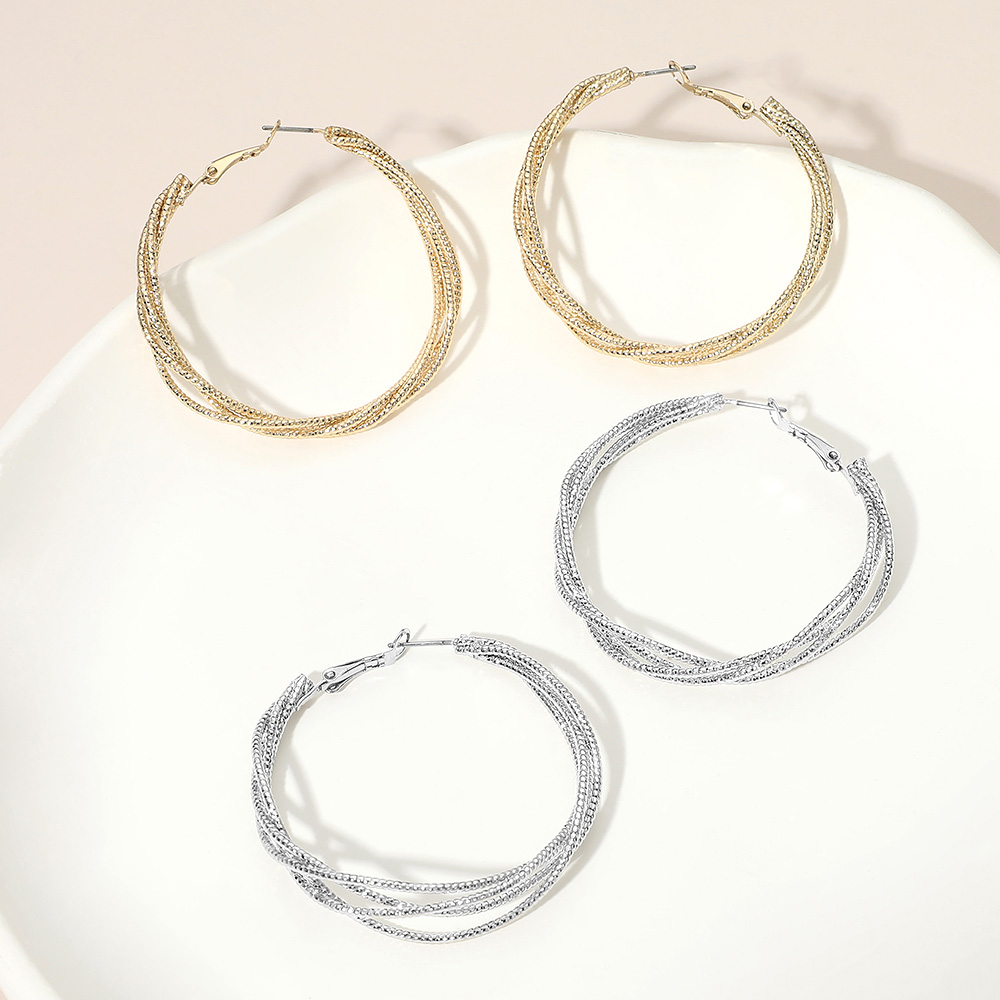 • Elegant layered hoop earrings designed with multiple intertwined strands that create depth and visual interest. A refined yet versatile accessory ideal for daily wear or special occasions, offering a polished statement that pairs effortlessly with casual outfits, work looks, and evening ensembles. Perfect for boutique jewelry assortments and gifting displays.