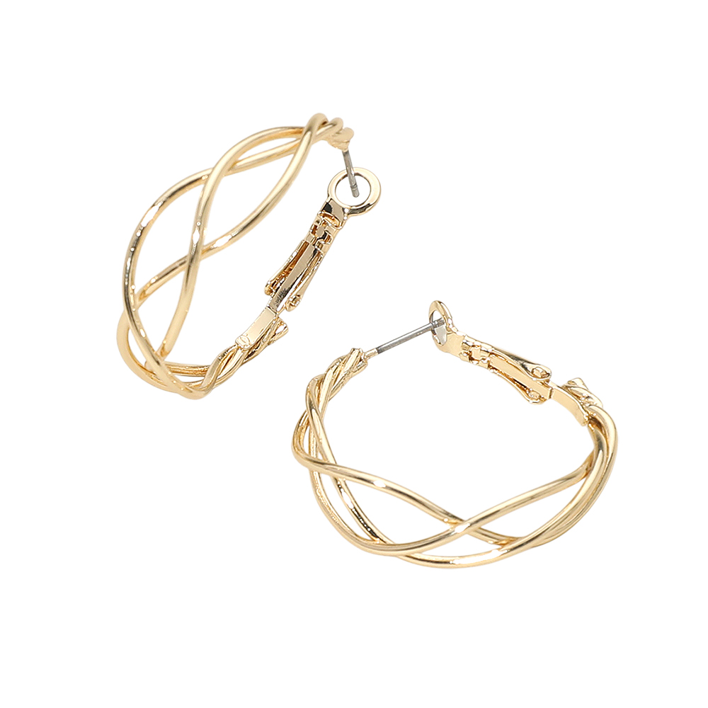 Details • Size : 1.25" X 1.25" X 0.4" • Omega Back • Chic hoop earrings featuring a twisted open crossover design that adds dimension and modern elegance. Lightweight and versatile, they enhance everyday outfits or evening looks with their airy, sculptural style and polished finish. • Lead and Nickel Compliant • Gold Dipped