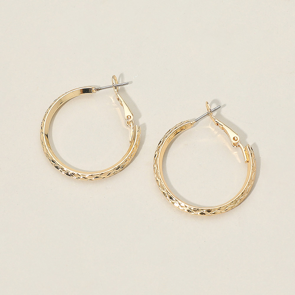 Details • Size : 1.2" X 1.2" • Omega Back • Chic small hoop earrings with a textured, diamond-cut look that adds stylish shine. Lightweight and comfortable with secure latch backs, perfect for daily wear or elevating casual and dressy outfits. • Lead and Nickel Compliant • Gold Dipped