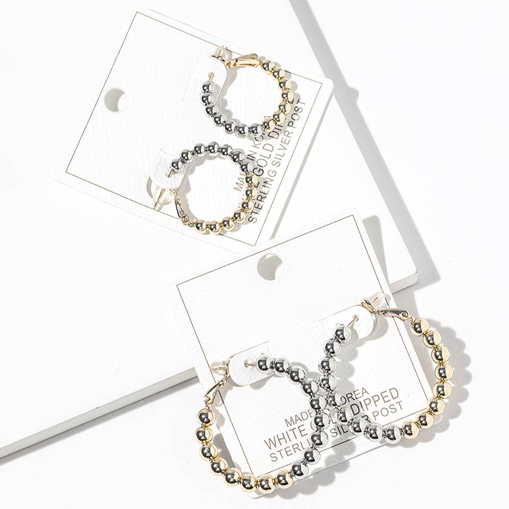 Details • Size : 0.8" X 0.9" • Omega Back • Stylish twisted hoop earrings designed with layered beaded detailing for a modern statement look. Lightweight yet eye-catching, these drop hoops add movement and texture to everyday outfits, workwear, or evening styles. A versatile accessory choice for trend-driven collections and boutique assortments. • Gold Dipped • Lead and Nickel Compliant • Made In Korea • Sterling Silver Post