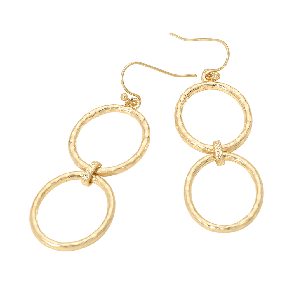 Details • Size : 0.75" X 2.25" • Fish Hook Back • Elegant double oval ring drop earrings designed with a softly textured finish for subtle movement and visual interest. The linked open-ring silhouette creates a modern yet timeless look that transitions easily from casual outfits to dressy occasions. Lightweight and easy to style, these earrings are ideal for everyday wear, gifting, and boutique jewelry collections. • Lead and Nickel Compliant