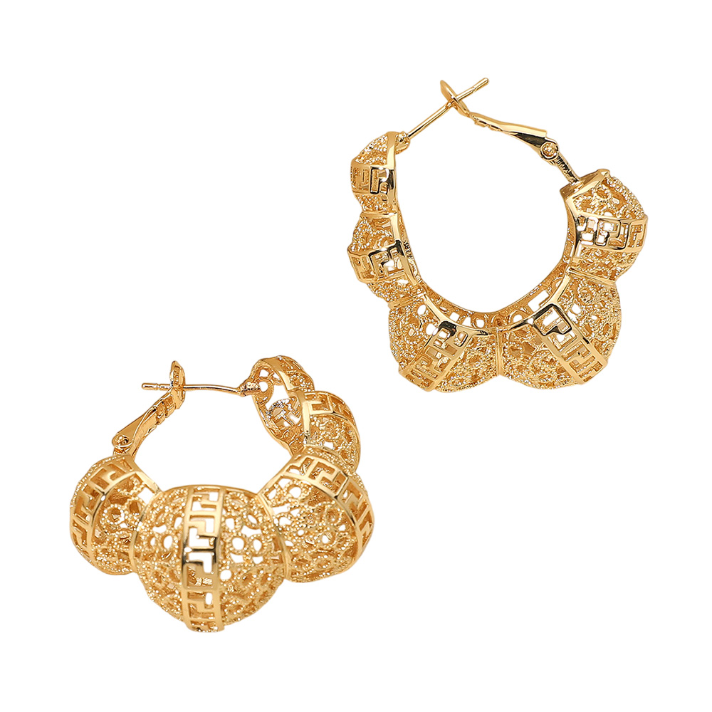 Details • Size : 1.6" X 1.5" • Omega Back • These cutout dome hoop earrings feature a bold sculpted design with intricate open lattice detailing for a striking textured effect. Their dimensional shape adds a touch of luxury and elegance, making them a perfect statement piece to elevate both casual and dressy ensembles. • Lead and Nickel Compliant