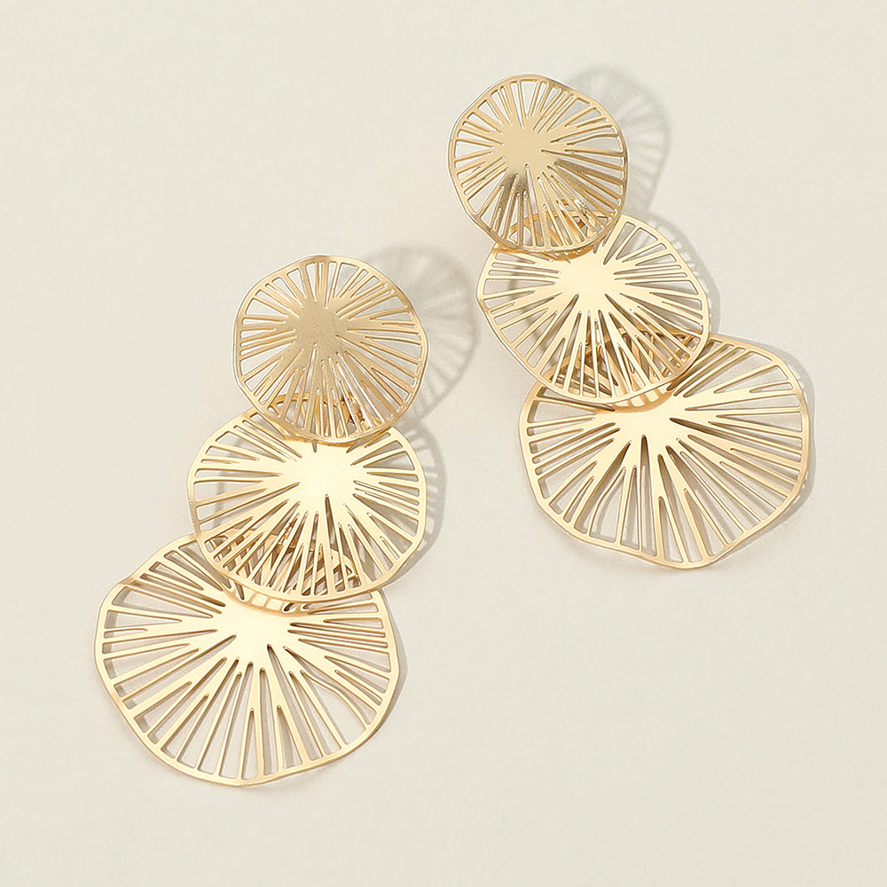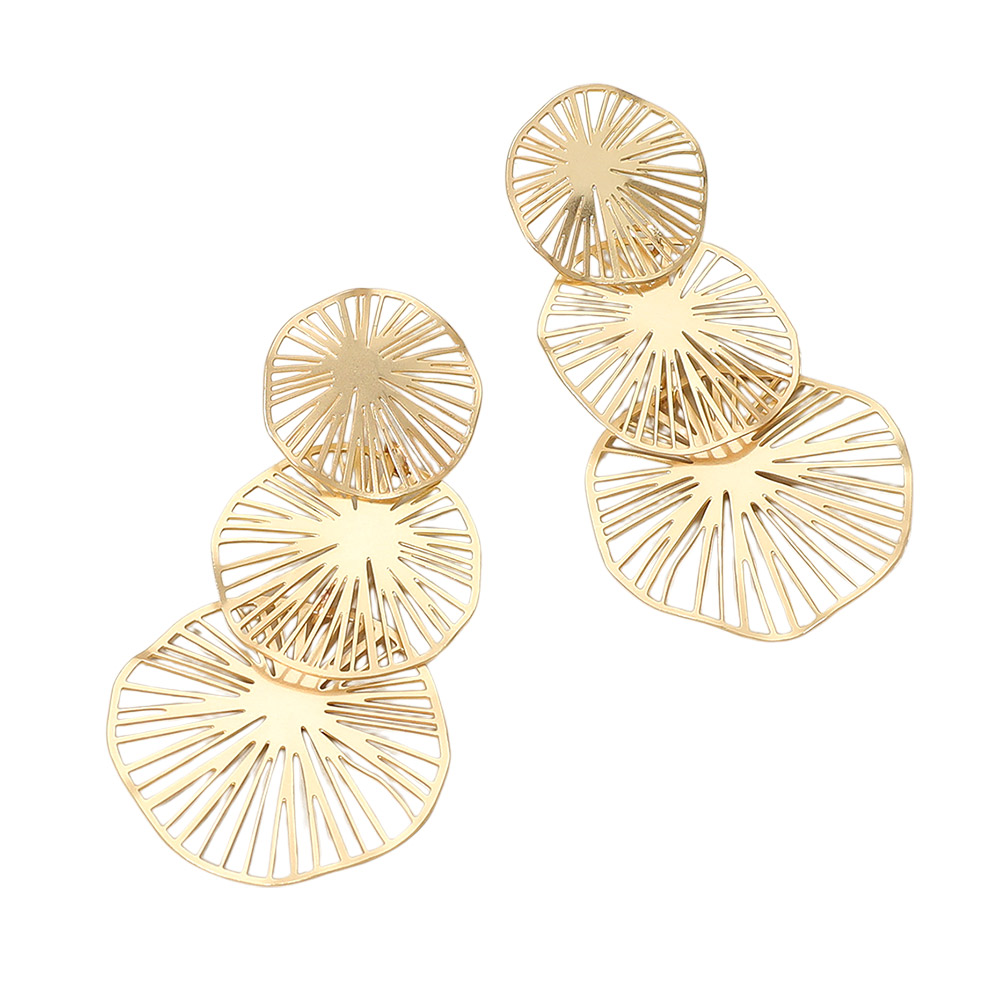 Details • Size : 1.1" X 2.1" • Post Back • These layered cutout dangle earrings feature a bold, sculptural silhouette with a radiating line design. Lightweight and statement-making, they're perfect for contemporary looks or artistic ensembles. • Lead and Nickel Compliant