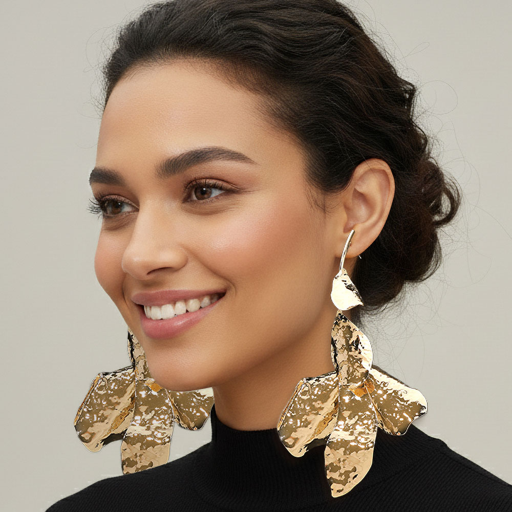 • Make a bold impression with these sculpted statement leaf dangle earrings. Featuring an abstract, hammered design that catches the light beautifully, they embody modern artistry and elegance. Perfect for elevating evening outfits or adding a dramatic edge to your daywear look.
