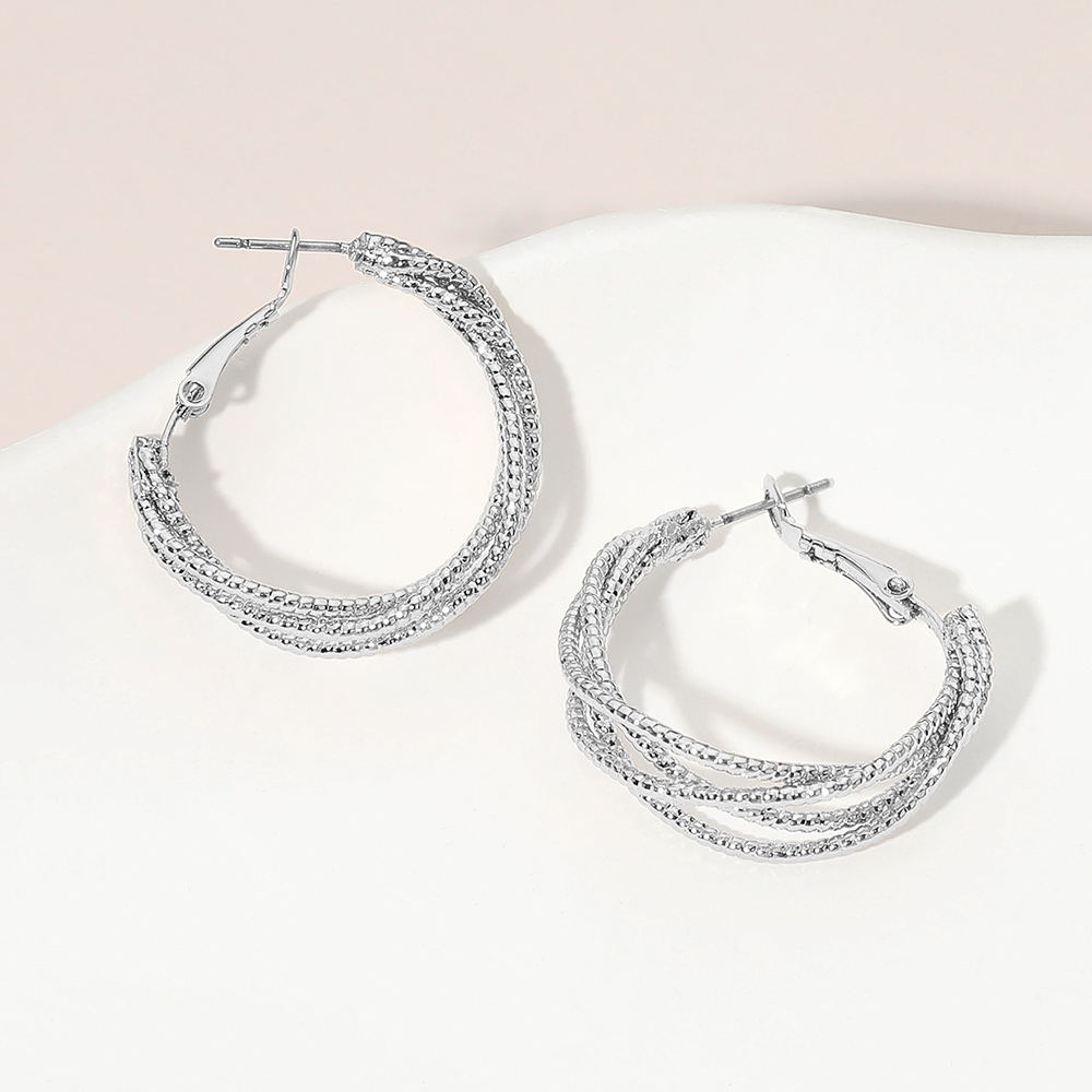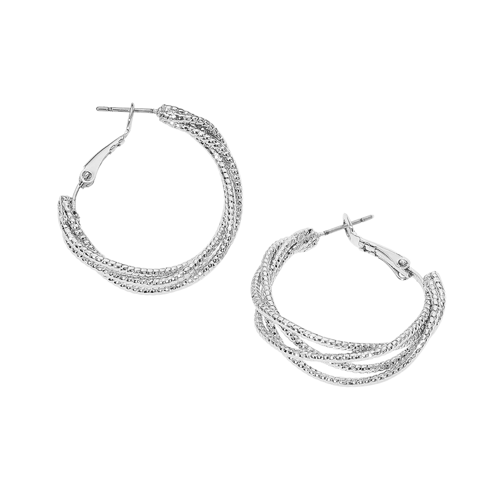 Details • Size : 1.25" X 1.25" • Omega Back • Elegant layered hoop earrings designed with multiple intertwined strands that create depth and visual interest. A refined yet versatile accessory ideal for daily wear or special occasions, offering a polished statement that pairs effortlessly with casual outfits, work looks, and evening ensembles. Perfect for boutique jewelry assortments and gifting displays. • Lead and Nickel Compliant • Sterling Silver Dipped