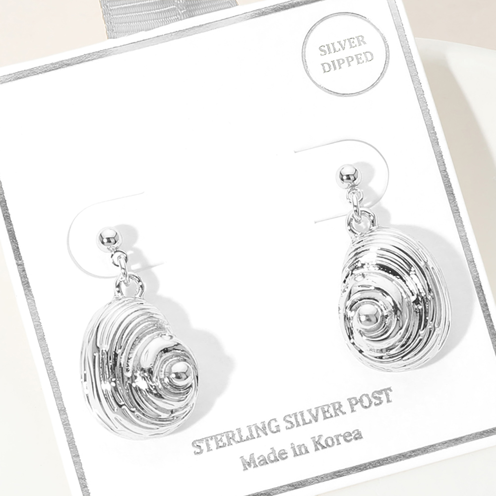 Details • Size : 0.5" X 1.1" • Seashell drop earrings featuring a textured spiral shell design and sterling silver posts. Lightweight and ocean-inspired, offering a polished coastal look for everyday wear or beach-themed outfits. • Sterling Silver Dipped • Lead and Nickel Compliant • Made In Korea • Sterling Silver Post