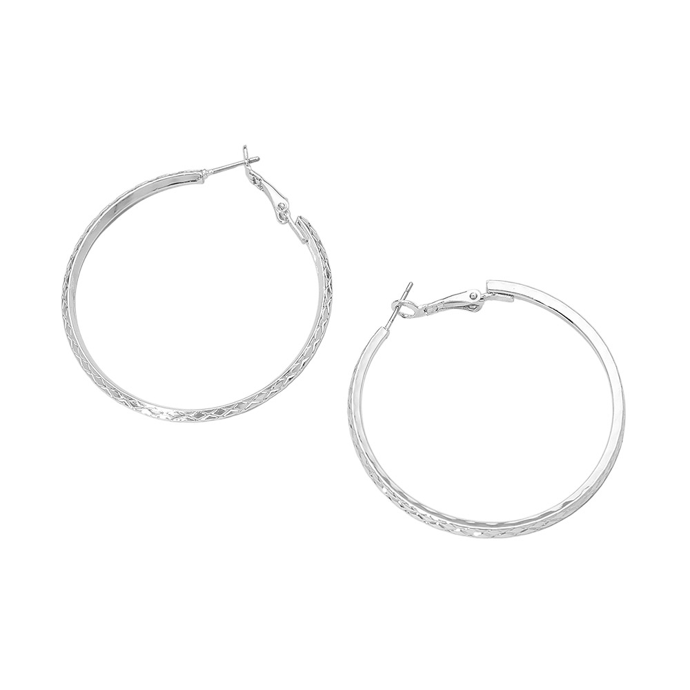 Details • Size : 2" X 2" • Omega Back • Stylish medium hoop earrings with a faceted textured finish that adds shine and dimension. Lightweight and easy to wear with secure latch backs, perfect for elevating everyday looks or adding a chic touch to dressy outfits. • Sterling Silver Dipped • Lead and Nickel Compliant