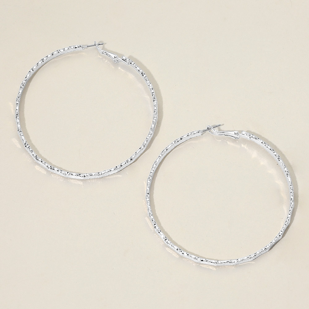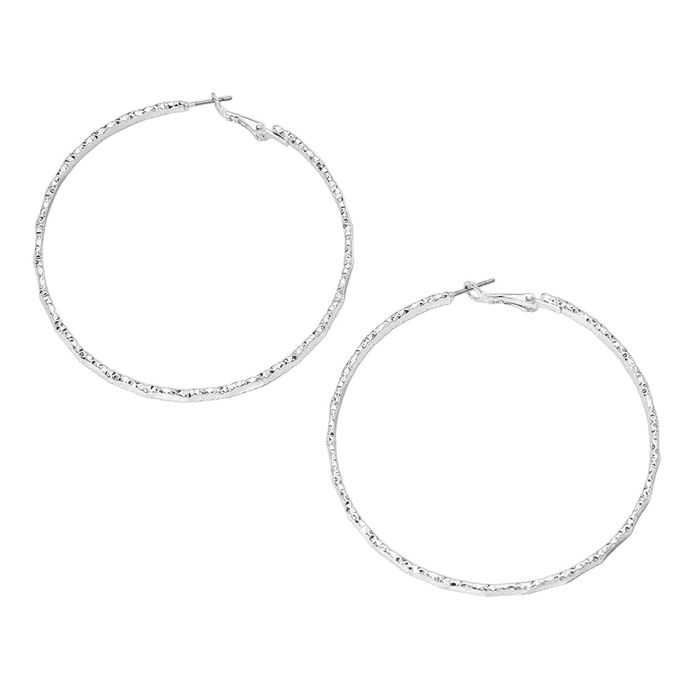 Details • Size : 2.75" X 2.75" • Omega Back • Elegant large textured hoop earrings featuring a subtle hammered-style finish for added shine and dimension. Lightweight and easy to wear with a secure latch-back closure, perfect for elevating everyday outfits or adding a stylish touch to dressy looks. • Sterling Silver Dipped • Lead and Nickel Compliant