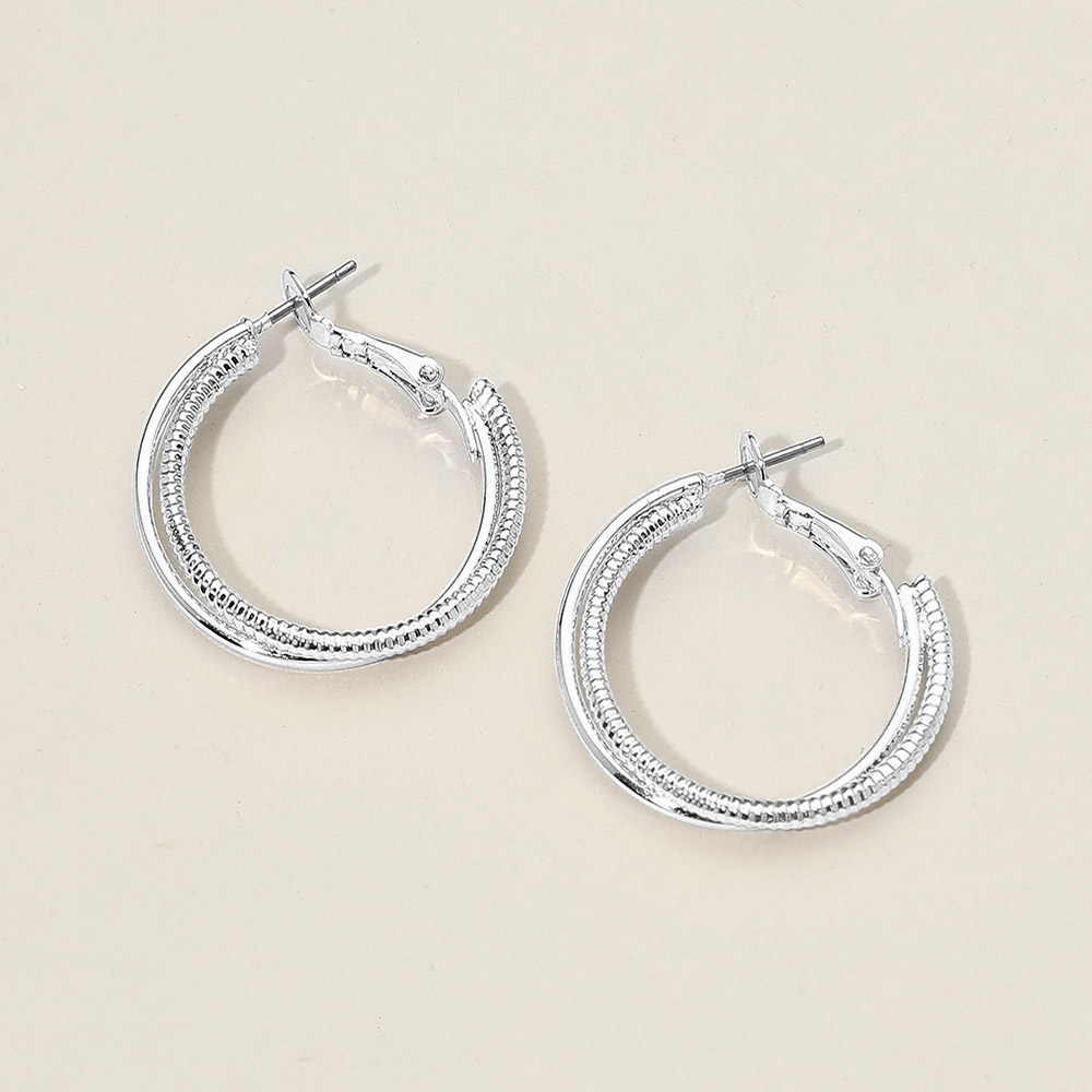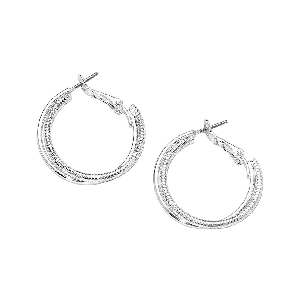 Details • Size : 2" X 2" • Omega Back • Small textured hoop earrings featuring a detailed beaded-edge design and smooth rounded profile. Lightweight and comfortable with secure latch-back closures, perfect for everyday wear or adding a polished touch to any occasion. • Sterling Silver Dipped • Lead and Nickel Compliant