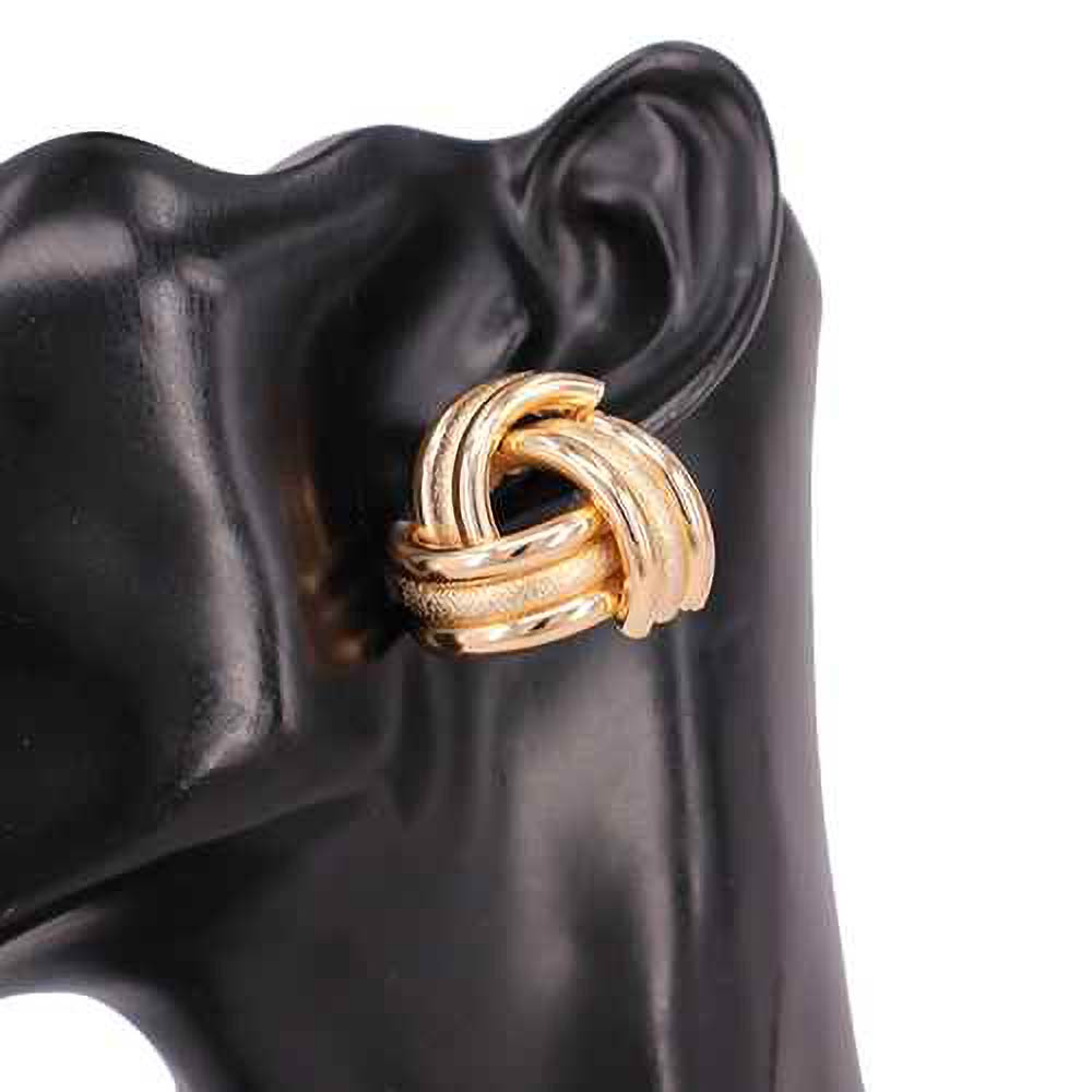 Details • Size : 1.3" X 1.3" • Post Back • These intertwined knot stud earrings showcase a sculptural metal design with layered curves and dimensional texture. Crafted for a refined yet bold look, they offer a timeless accent that complements everyday outfits, workwear, or evening styles with effortless sophistication. • Lead and Nickel Compliant