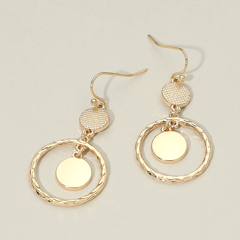 Details • Size : 0.8" X 1.75" • Fish Hook Back • Elevate everyday style with these textured hoop disc drop earrings. Featuring a circular open hoop paired with a smooth hanging disc and a subtle textured top accent, this design adds depth and gentle movement. Lightweight and comfortable, they transition easily from casual wear to work and evening looks. A versatile accessory that complements modern, minimalist, and seasonal collections while offering timeless appeal and effortless styling. • Lead and Nickel Compliant