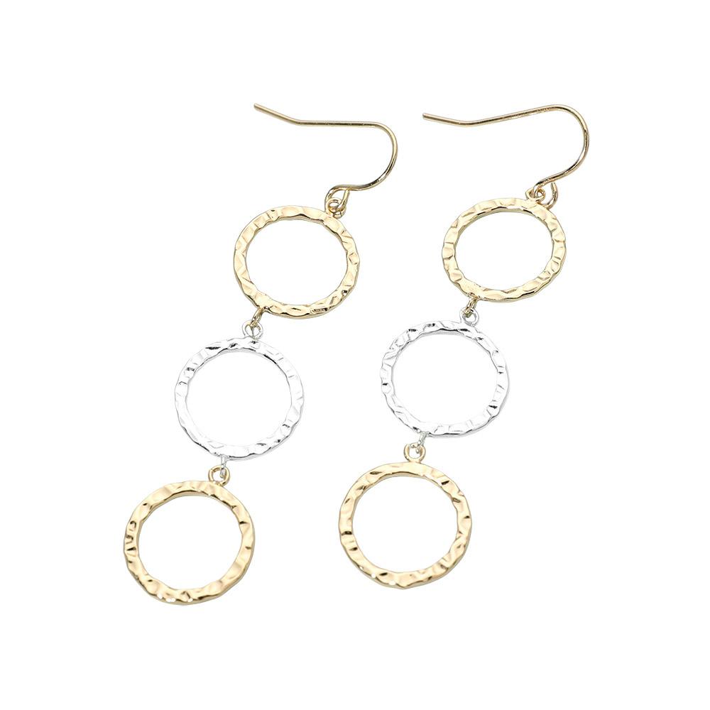 Details • Size : 0.6" X 2.5" • Fish Hook Back • Modern drop earrings featuring layered open circle links with a lightly textured finish for subtle movement and visual interest. Designed to elevate everyday outfits or complement dressy looks, these versatile earrings offer a balanced statement that feels effortless and contemporary. A strong choice for boutiques seeking clean, trend-forward accessories that pair easily with multiple styles. • Lead and Nickel Compliant