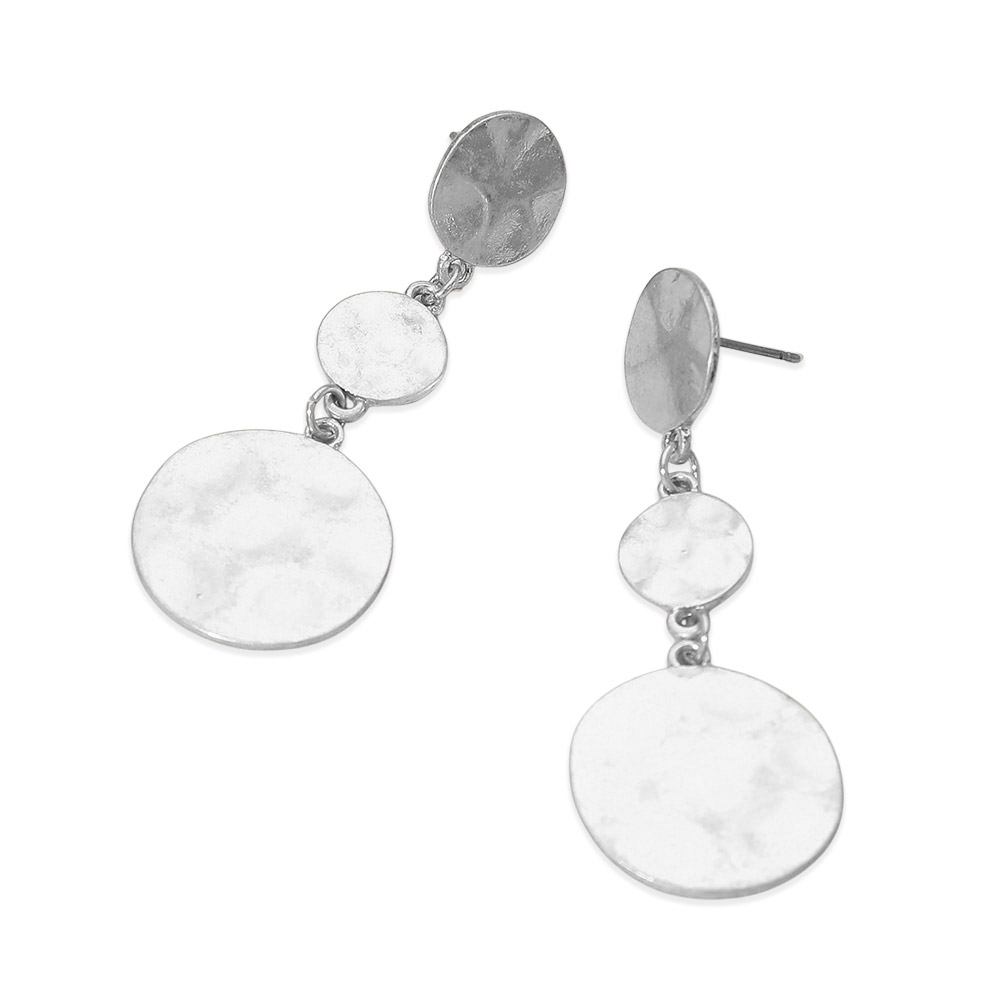 Details • Size : 0.8" X 2.25" • Post Back • Stylish drop earrings featuring layered hammered disc shapes that create organic texture and natural movement. The cascading design offers a modern yet timeless look, making these earrings easy to style with everyday outfits, workwear, or elevated occasions that call for subtle statement jewelry. • Lead and Nickel Compliant