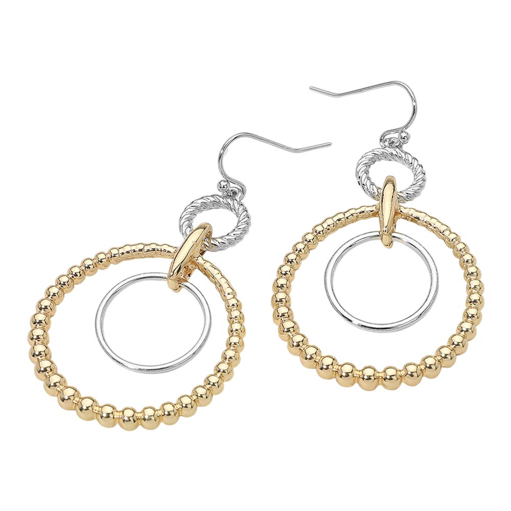 Details • Size : 1.3" X 2.25" • Fish Hook Back • Statement drop earrings featuring layered ring details with a beaded outer hoop and smooth inner circle for a modern mixed-design look. Designed to add depth and movement, these earrings elevate everyday outfits and complement casual, office, or evening styling with effortless versatility. • Lead and Nickel Compliant