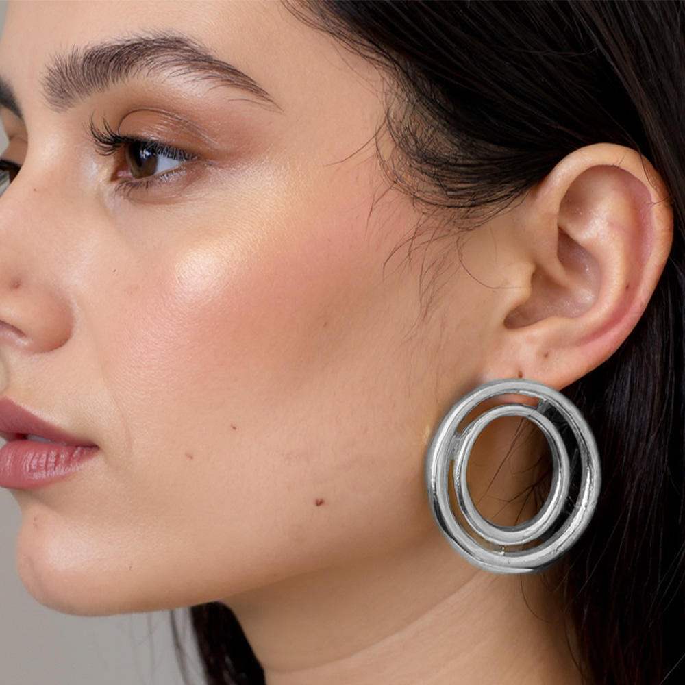 • Contemporary double oval stud earrings with a sleek geometric design. Their polished finish and lightweight feel make them perfect for adding a modern touch to everyday outfits or elevating evening looks with minimalist sophistication.