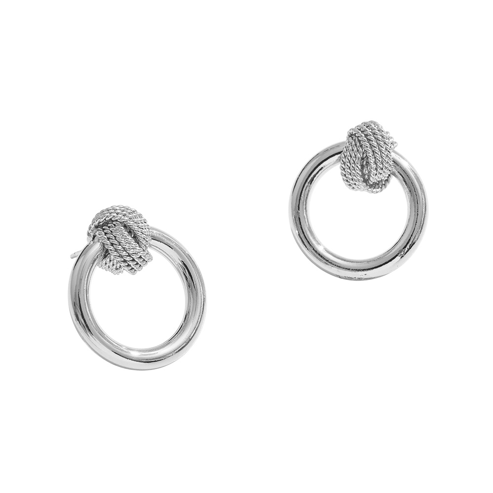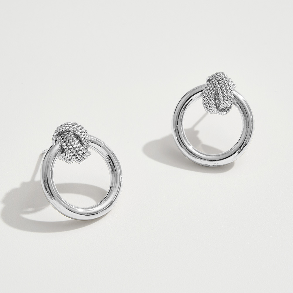 Details • Size : 0.7" X 0.75" • Post Back • These chic knot and hoop earrings showcase a textured knot detail paired with a smooth circular hoop, creating a stylish balance of boldness and elegance. Ideal for both casual and dressy outfits, they add a modern yet timeless accent to your jewelry collection. • Brass • Gold Dipped • Hypoallergenic • Lead and Nickel Compliant • Made In Korea