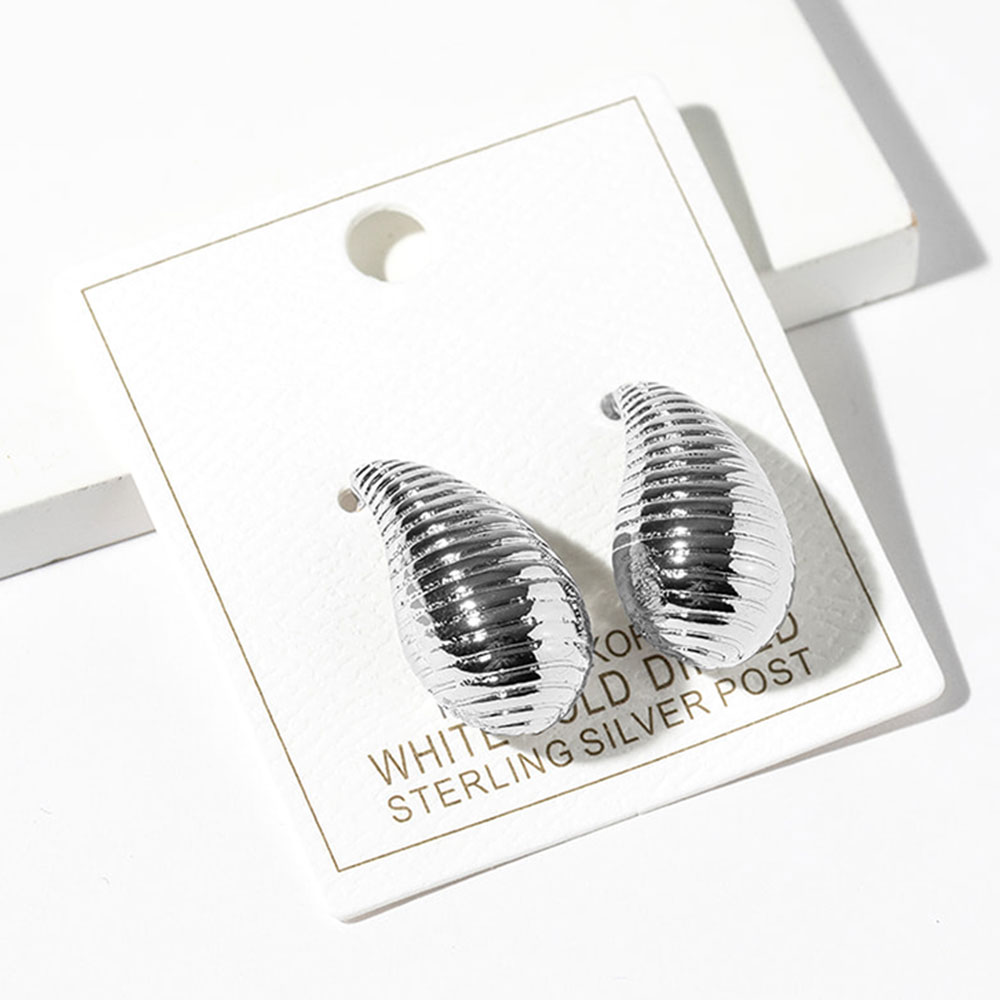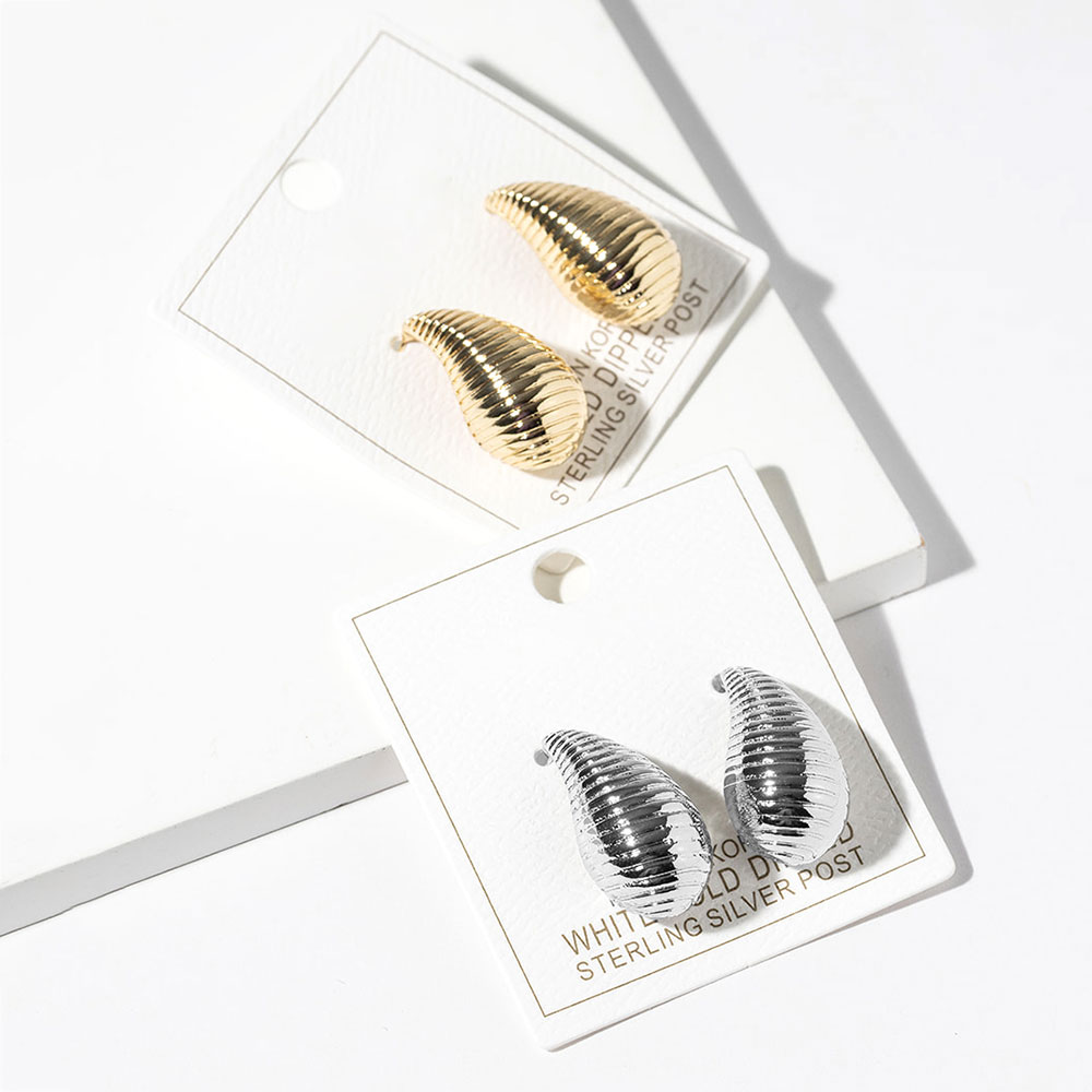 • Modern teardrop stud earrings featuring a sculpted ribbed texture for a sleek, dimensional look. Designed to reflect light beautifully, these studs offer a refined statement that transitions effortlessly from everyday wear to evening styling, making them a versatile addition to any accessory collection.
