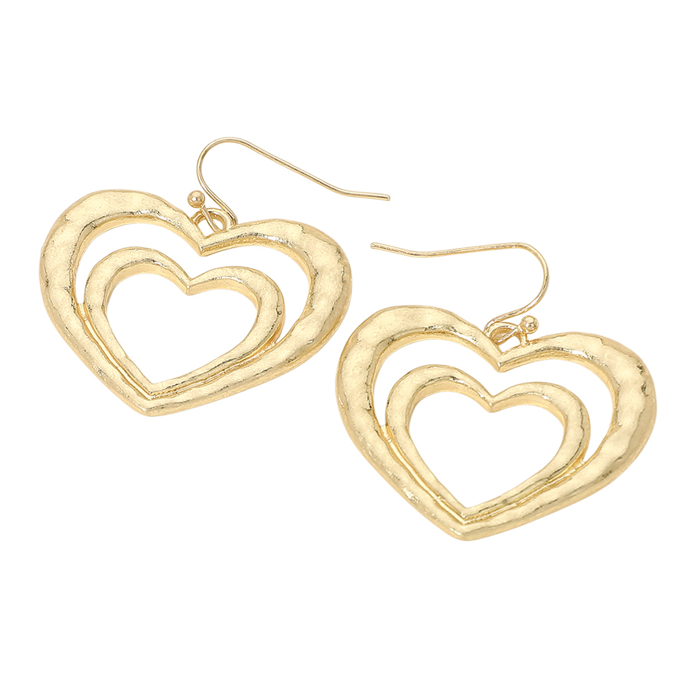 Details • Size : 1.3" X 1.5" • Fish Hook Back • Romantic double heart drop earrings featuring layered open heart silhouettes with a softly sculpted finish. Designed to add movement and charm, these lightweight earrings offer an easy hook style that works for everyday outfits, date nights, or seasonal gifting displays. Perfect for boutique jewelry collections. • Lead and Nickel Compliant