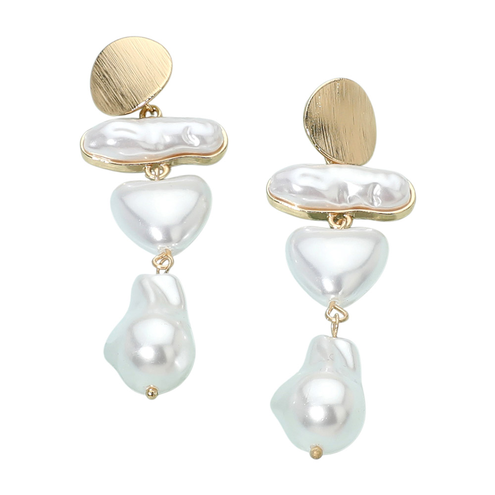 Details • Size : 1" X 3" • Post Back • Modern drop earrings featuring layered abstract shapes with smooth pearl accents that create elegant movement and visual interest. Designed to elevate everyday outfits and complement dressy looks, this statement style offers a refined balance of organic form and contemporary appeal, making it ideal for boutiques seeking versatile accessories that feel elevated, feminine, and on trend. • Lead and Nickel Compliant