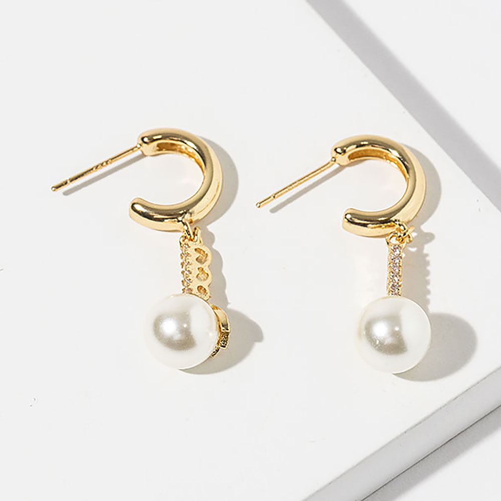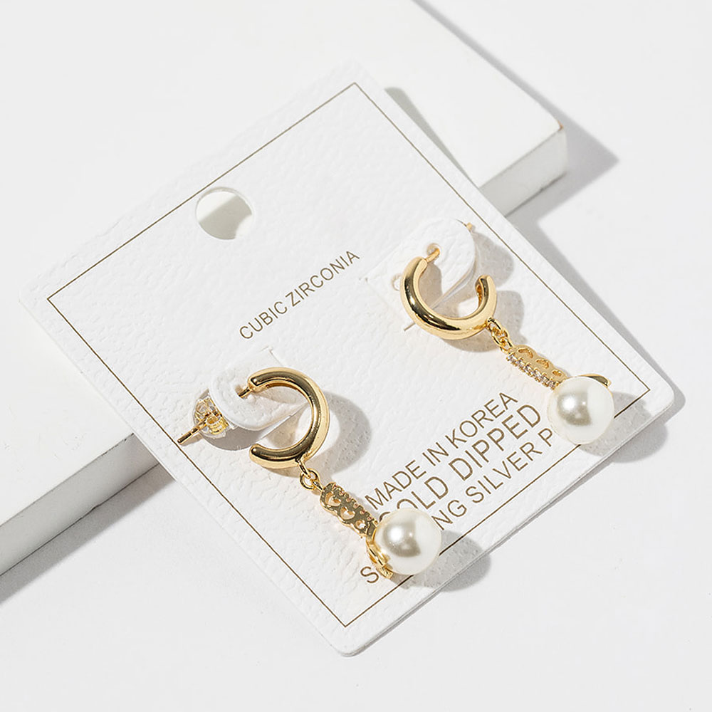 Details • Size : 0.5" X 1.3" • Elegant hoop earrings featuring a smooth curved silhouette paired with a single round drop and a delicate CZ-accent connector. Designed to add gentle movement and refined charm, this versatile style transitions effortlessly from everyday outfits to dressy occasions and layered accessory looks. • CZ Cubic Zirconia • Gold Filled • Lead and Nickel Compliant • Made In Korea • Sterling Silver Post