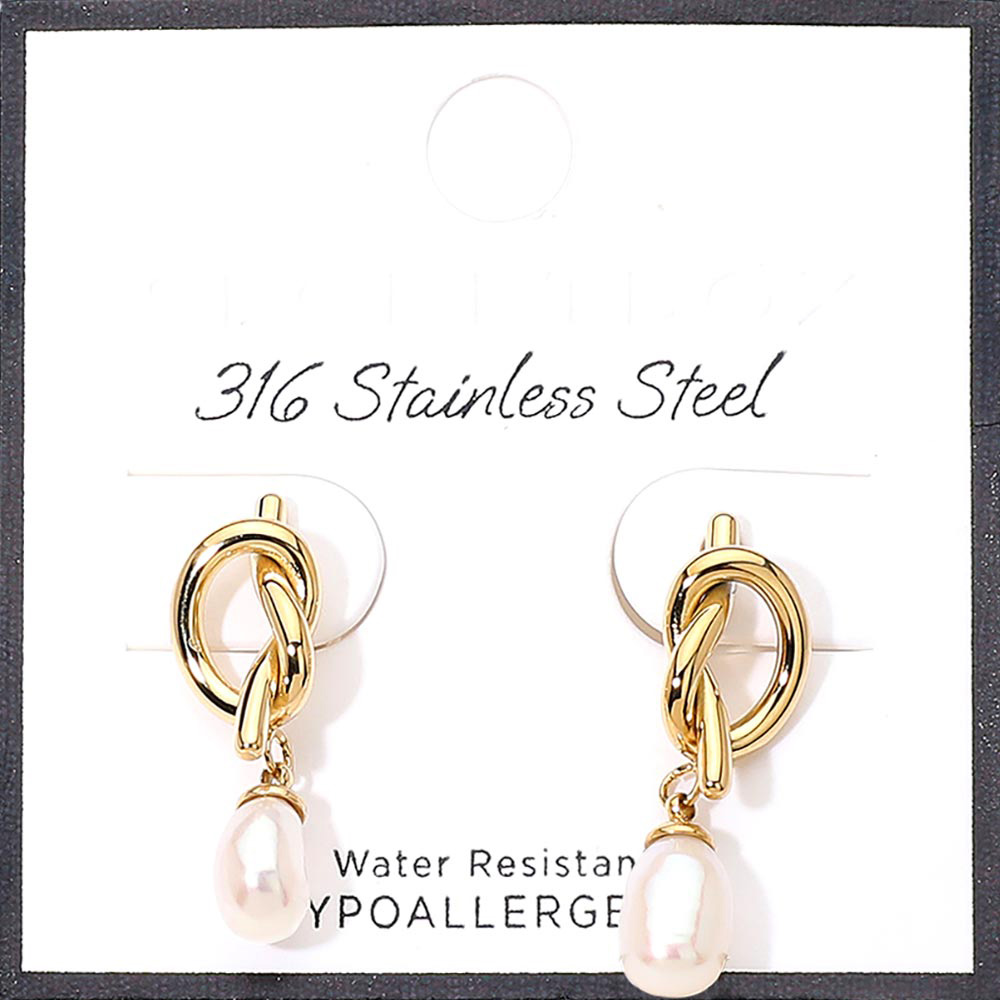 SECRET BOX_Stainless Steel Knot Pearl Drop Earrings
