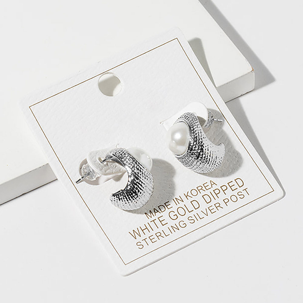 • Textured crescent stud earrings featuring a sculpted curved shape with a smooth round pearl accent for a refined, modern look. Designed to elevate everyday styling, these studs pair effortlessly with casual outfits, office wear, or layered ear looks, offering timeless appeal with subtle statement detail.