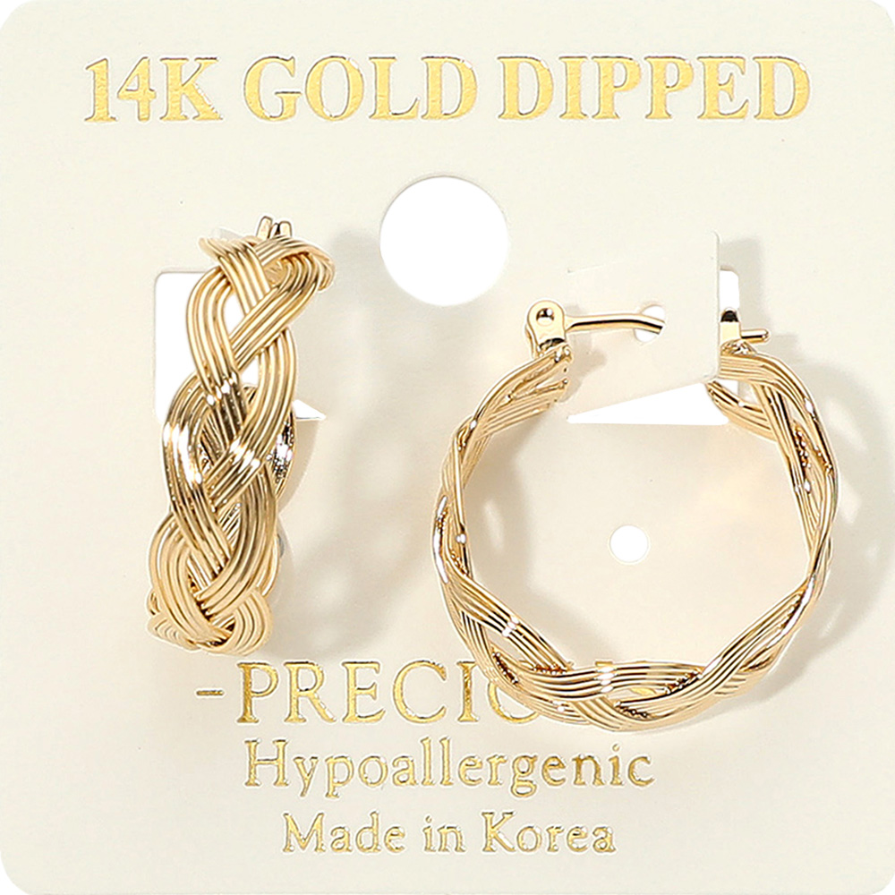 14K Gold Dipped Hypoallergenic Textured Braided Pin Catch Hoop Earrings