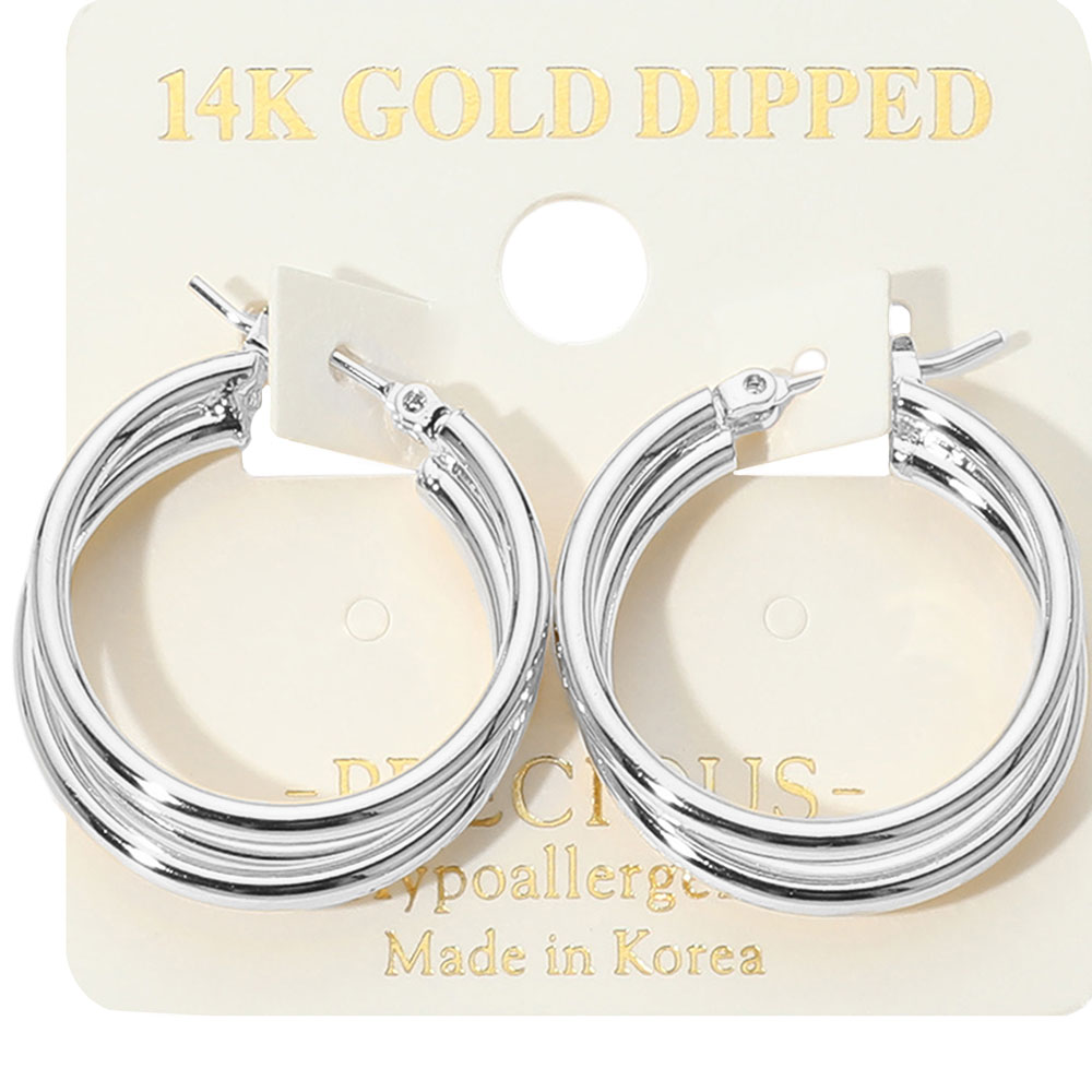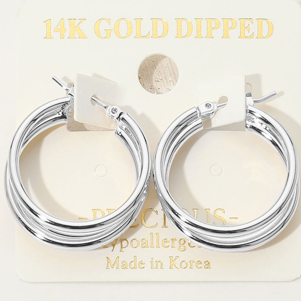 Details • Size : 1" X 1.1" • Pin Catch • These triple hoop earrings feature a layered design that blends bold style with timeless appeal. Lightweight and hypoallergenic, they offer a versatile look perfect for adding a polished finish to both casual outfits and elegant evening wear. • Gold Dipped • Hypoallergenic • Made In Korea
