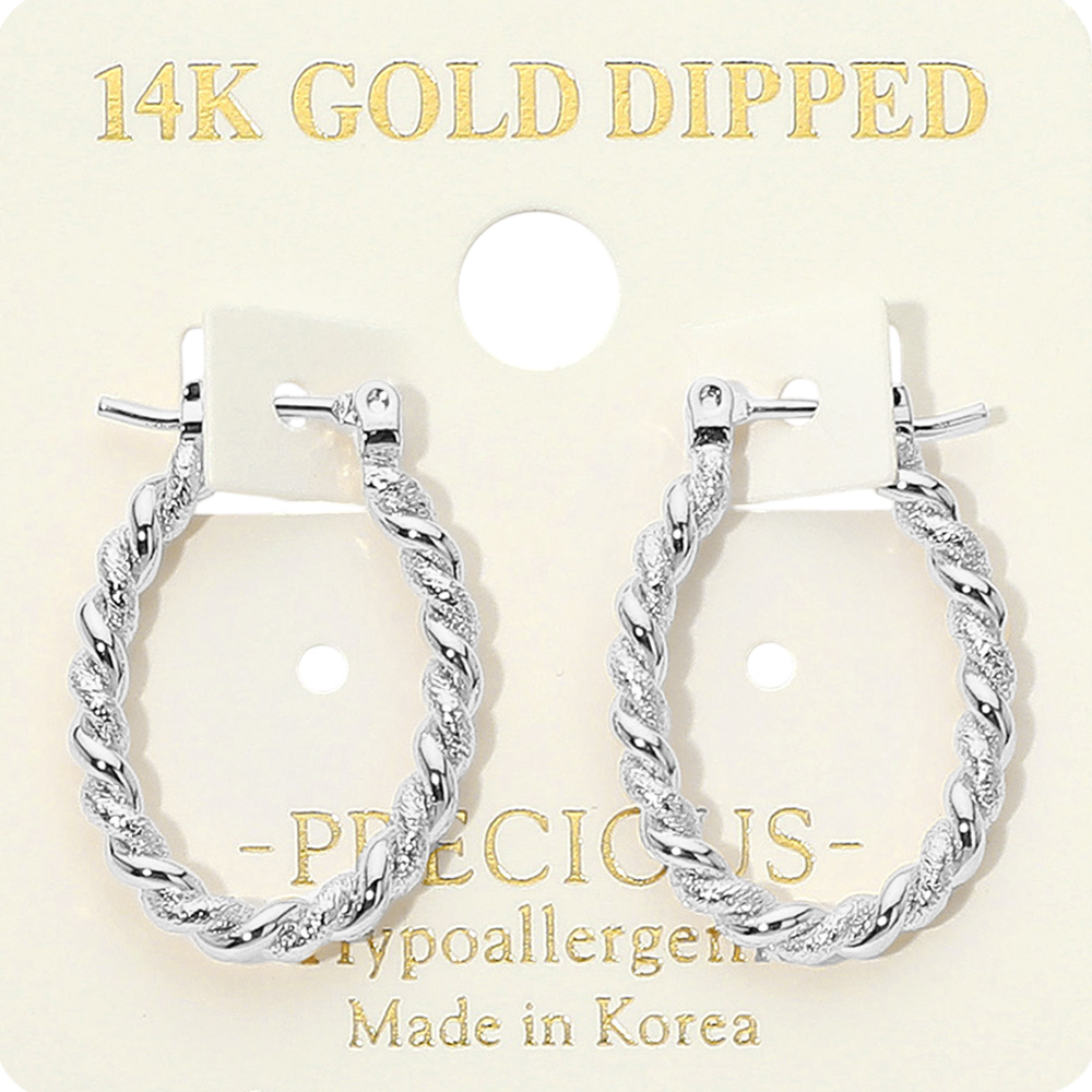 Details • Size : 0.75" X 1" • Pin Catch • These twisted hoop earrings bring refined texture and dimension to your style with their braided design and shimmering finish. Perfect for both everyday elegance and evening charm, they offer a timeless balance of sophistication and versatility for any occasion. • Gold Dipped • Hypoallergenic • Made In Korea