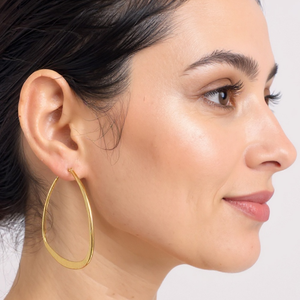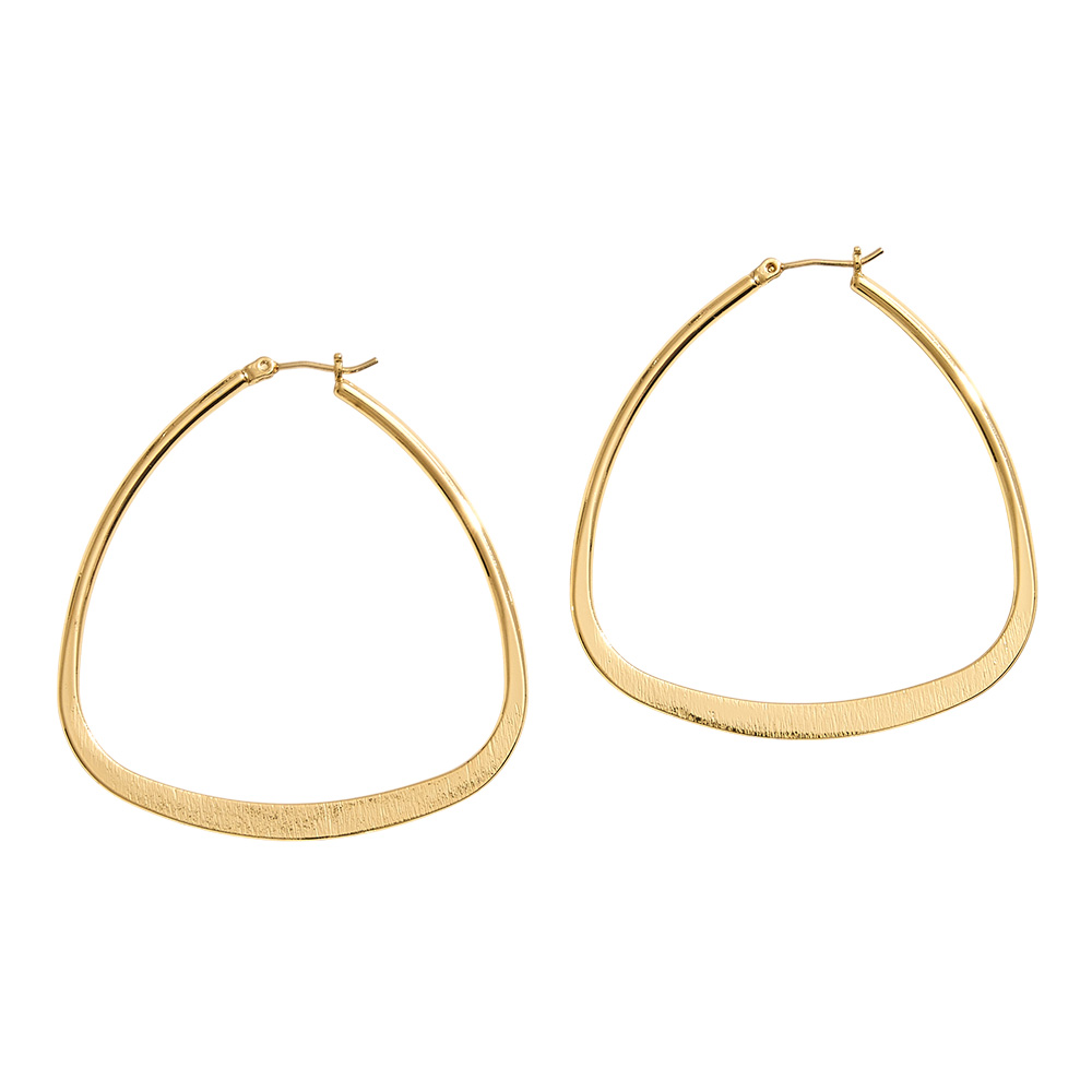Details • Size : 2" X 2" • Pin Catch • Elevate your everyday look with these geometric triangle hoop earrings, designed with a sleek open silhouette that blends minimalism and edge. Their clean, contemporary lines make them a versatile statement piece for modern style that transitions from day to night with ease. • Brass • Gold Dipped • Hypoallergenic • Lead and Nickel Compliant • Made In Korea