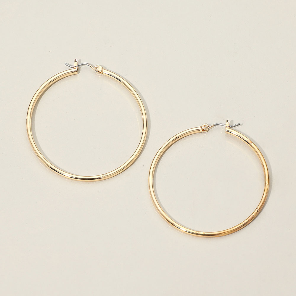 Details • Size : 2" X 2" • Pin Catch • Sleek thin hoop earrings designed with a smooth, lightweight finish for effortless everyday wear. Their clean, minimalist style pairs with any outfit, making them a timeless accessory for casual looks, work attire, or evening outfits. Perfect for adding simple, elegant flair to any jewelry collection. • Lead and Nickel Compliant • Gold Dipped