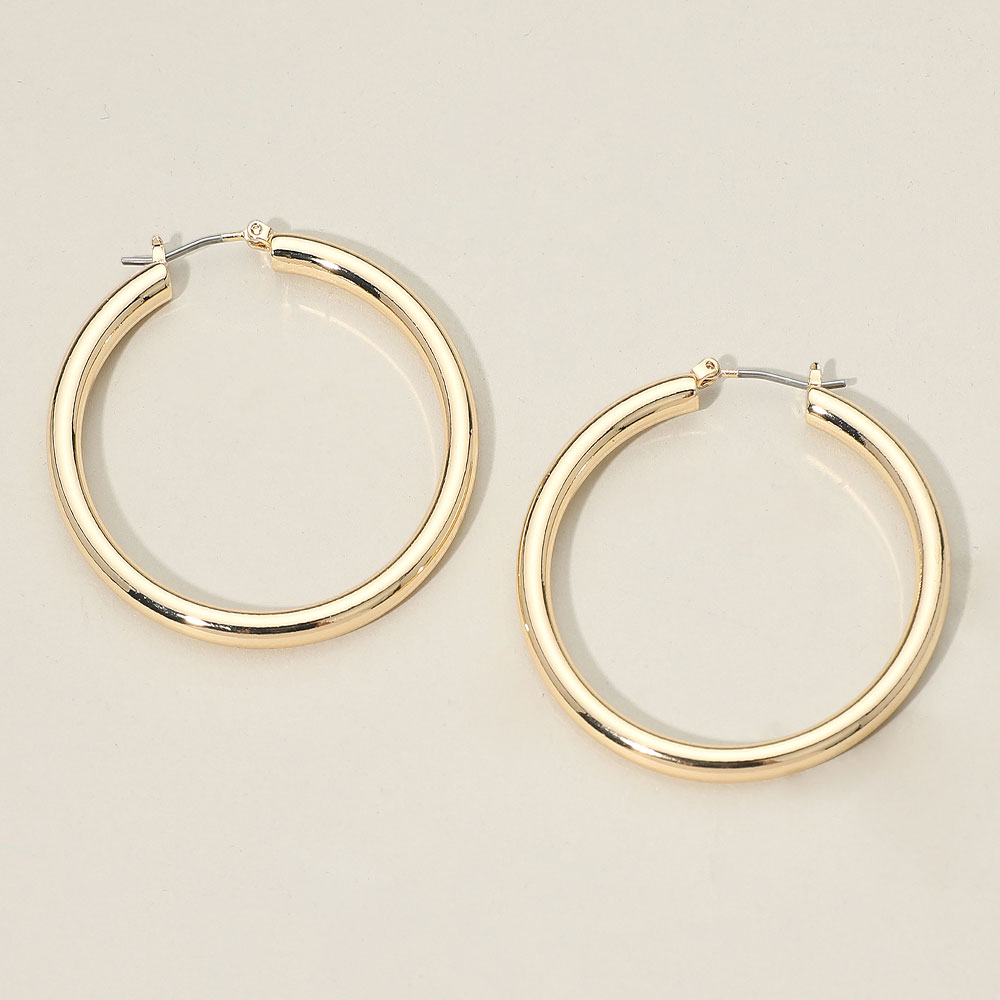 Details • Size : 2" X 2" • Pin Catch • Bold thick hoop earrings featuring a smooth, polished round design that adds a modern statement to any look. Lightweight and comfortable for all-day wear, these timeless hoops complement casual outfits, work attire, and dressy styles, making them a versatile must-have accessory. • Lead and Nickel Compliant • Gold Dipped