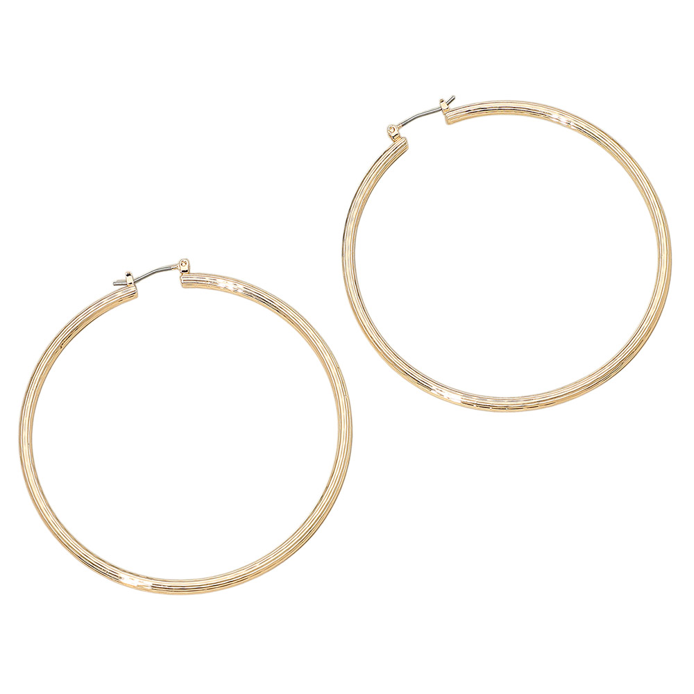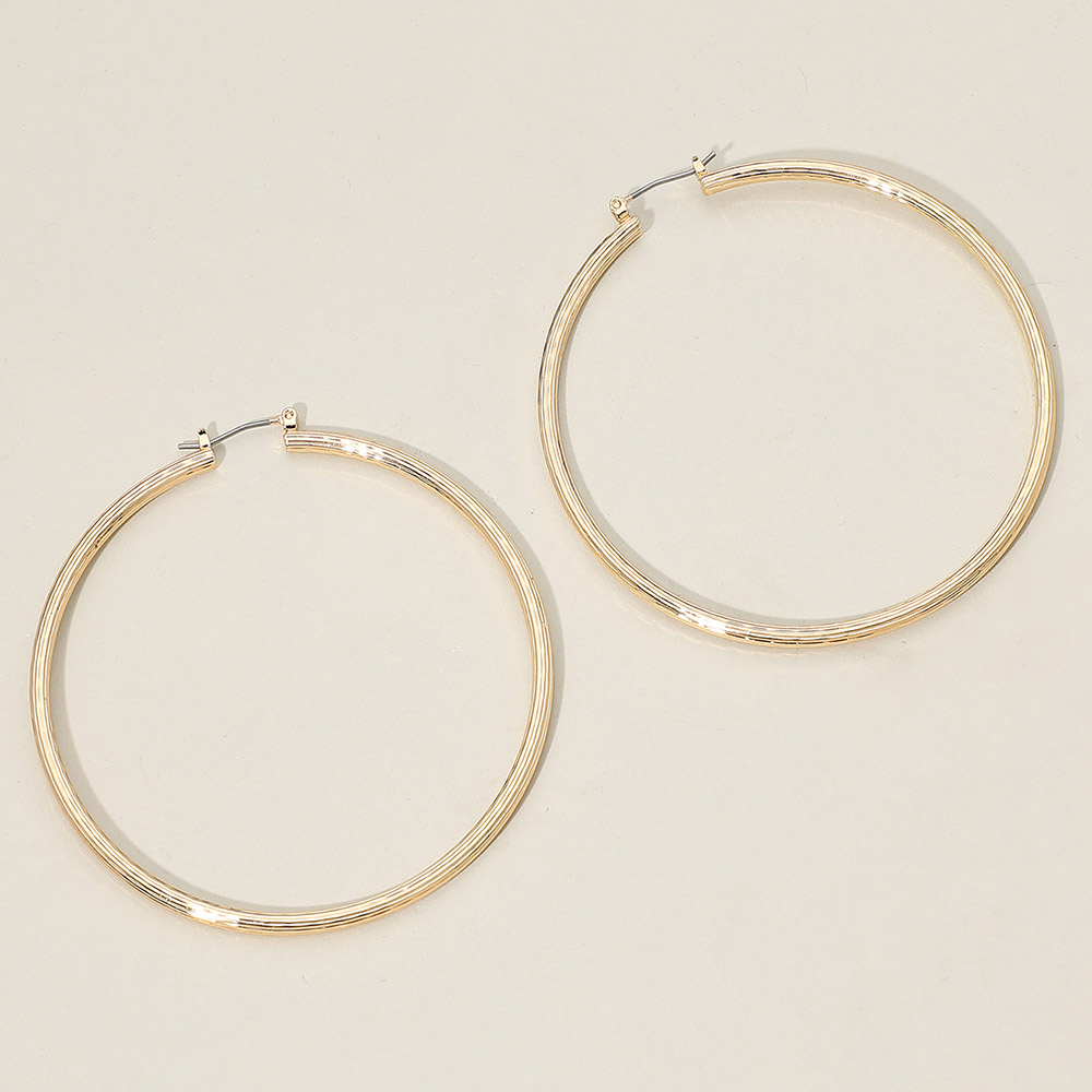 Details • Size : 2.75" X 2.75" • Pin Catch • Large textured hoop earrings designed with a lightweight, comfortable fit for daily style. The classic round silhouette pairs effortlessly with casual or dressy looks. Secure latch closure ensures easy wear. A timeless accessory choice ideal for gifting or adding shine to any jewelry collection. • Lead and Nickel Compliant • Gold Dipped