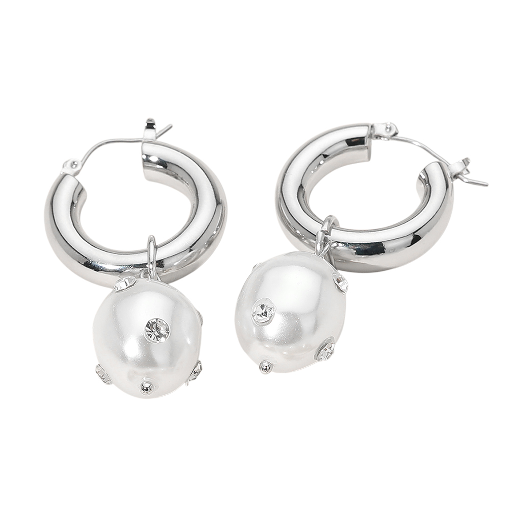 Details • Size : 1.1" X 2.25" • Pin Catch • Modern hoop drop earrings featuring a smooth rounded pearl charm accented with subtle sparkle details for added dimension. This versatile design blends classic structure with contemporary appeal, making it ideal for everyday styling, special occasions, and fashion-forward accessory collections. • Lead and Nickel Compliant