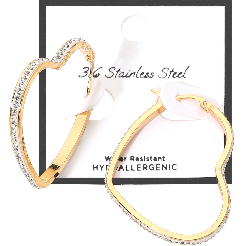 Details • Size : 1.5" X 1.75" • Pin Catch • Water Resistant • Stylish heart-shaped hoop earrings featuring shimmering crystal accents for a chic, romantic look. Lightweight design perfect for everyday wear or special occasions, offering a unique shape that elevates any outfit with playful elegance. • Hypoallergenic • Stainless Steel