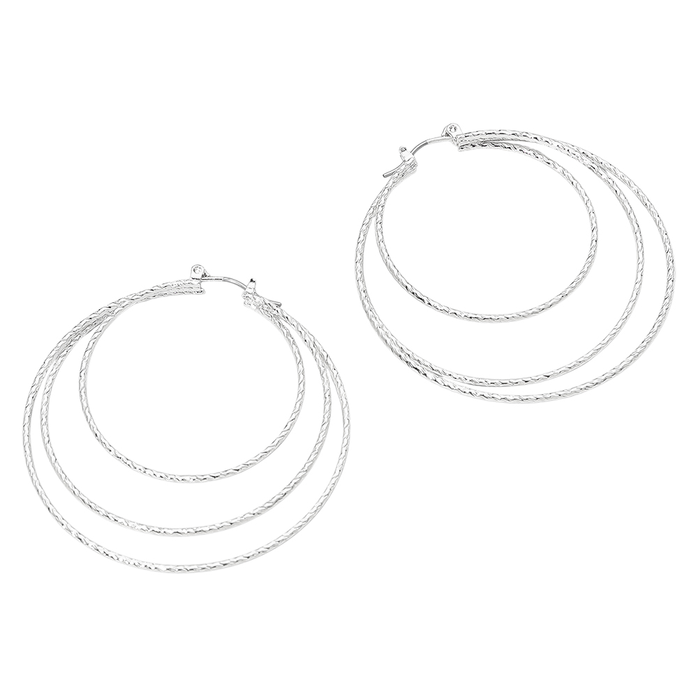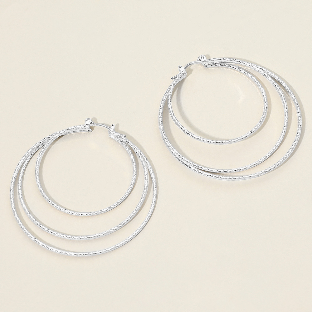 Details • Size : 2" X 2" • Pin Catch • Stylish triple hoop earrings featuring a textured layered open-circle design for a bold yet lightweight statement. Perfect for elevating everyday outfits or adding a modern touch to evening looks with their clean, dimensional silhouette. • Sterling Silver Dipped • Lead and Nickel Compliant